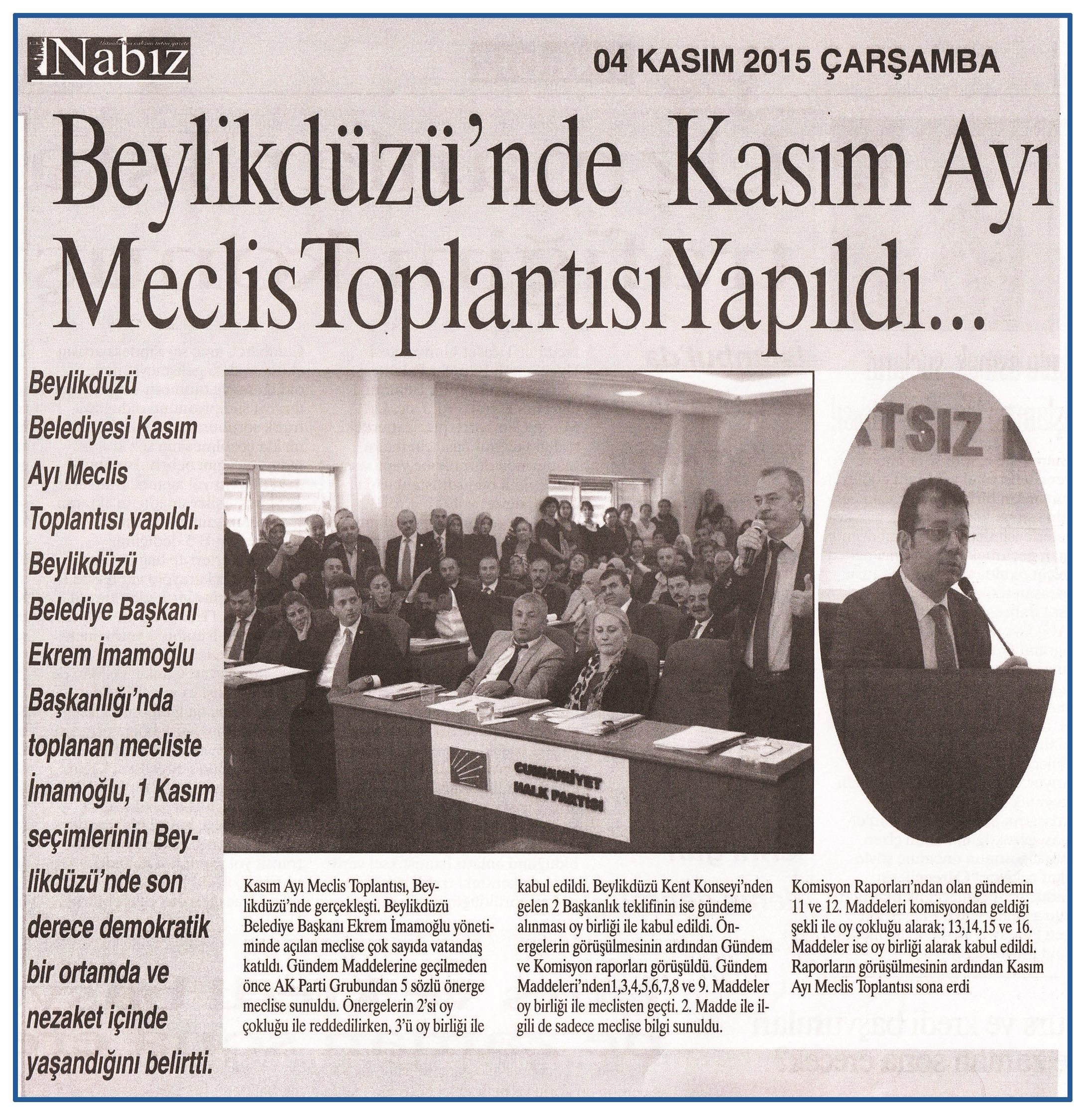 4 Kasım 2015 tarihli "NABIZ" gazetesi. Beylikdüzü Belediyesi Kasım Ayı Meclis Toplantısı yapıldı.