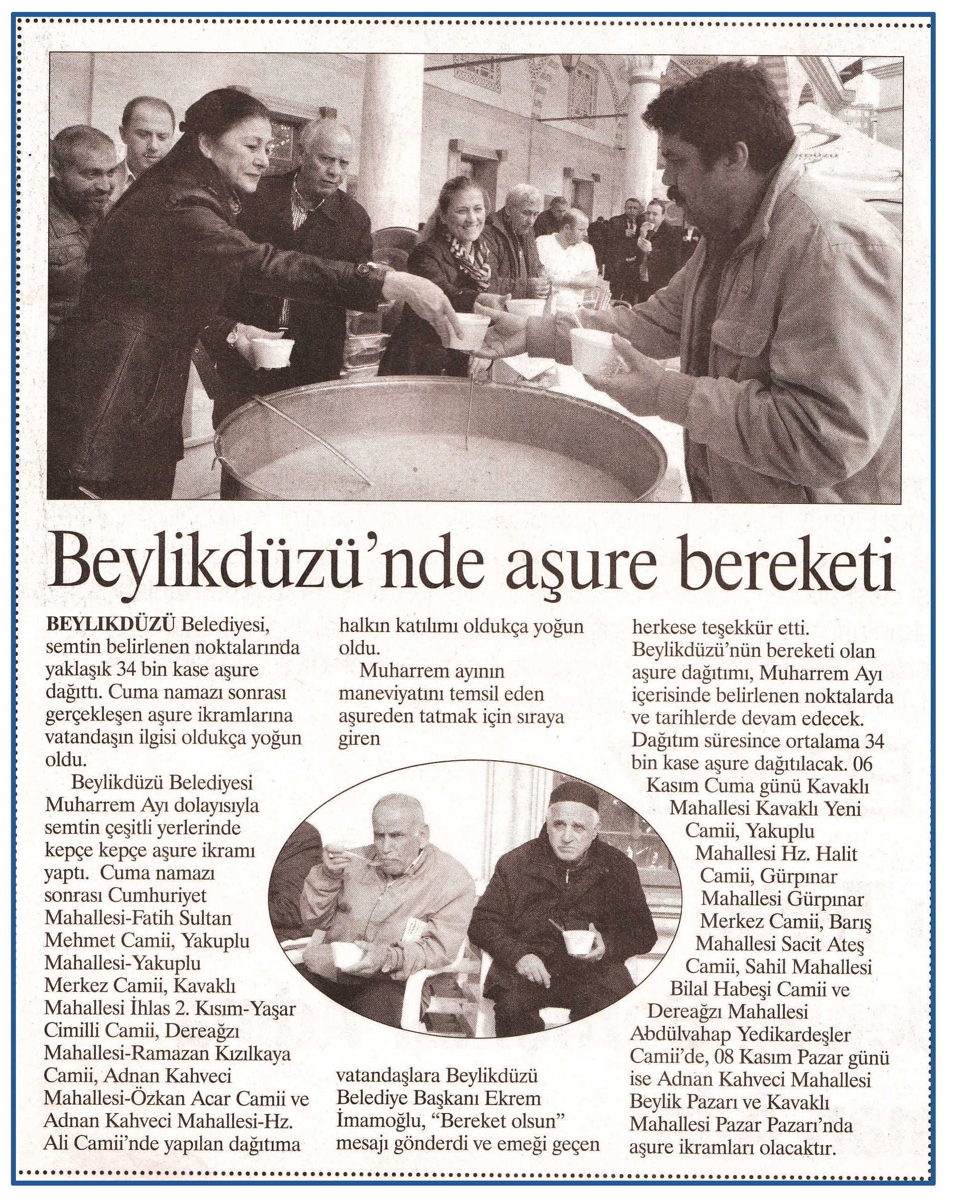 5 Kasım 2015 tarihli "KENT HABER" gazetesi. Beylikdüzü Belediyesi, semtin belirlenen noktalarında yaklaşık 34 bin kase aşure dağıttı. Cuma namazı sonrası gerçekleşen aşure ikramlarına vatandaşın ilgisi oldukça yoğun oldu.