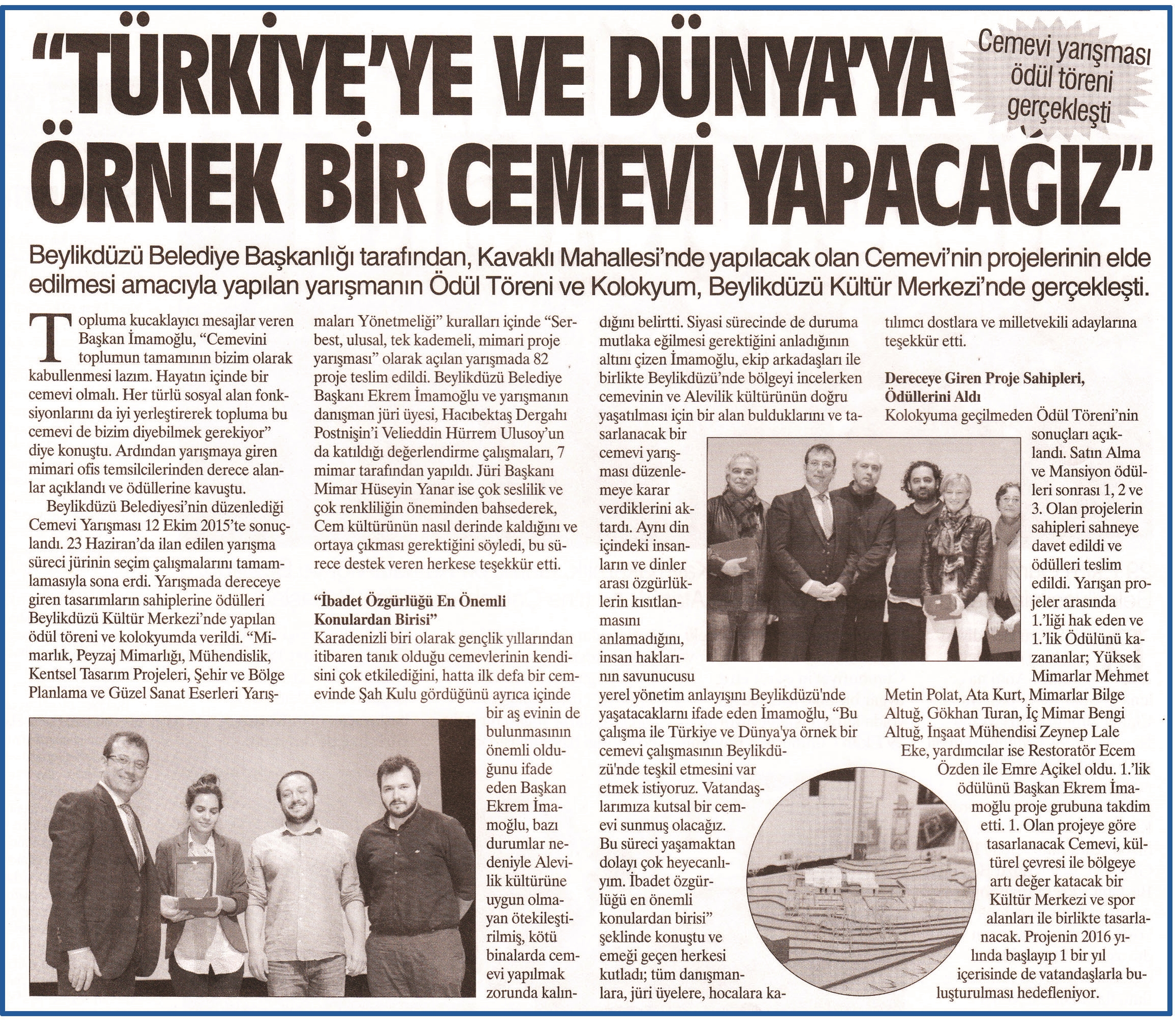 5 Kasım 2015 tarihli "SIRDAŞ HABER" gazetesi. Beylikdüzü Belediye Başkanlığı tarafından Kavaklı Mahallesi'nde yapılacak olan Cemevi'nin projelerinin elde edilmesi amacıyla yapılan yarışmanın Ödül Töreni ve Kolokyum, Beylikdüzü Kültür Merkezi'nde gerçekleşti.