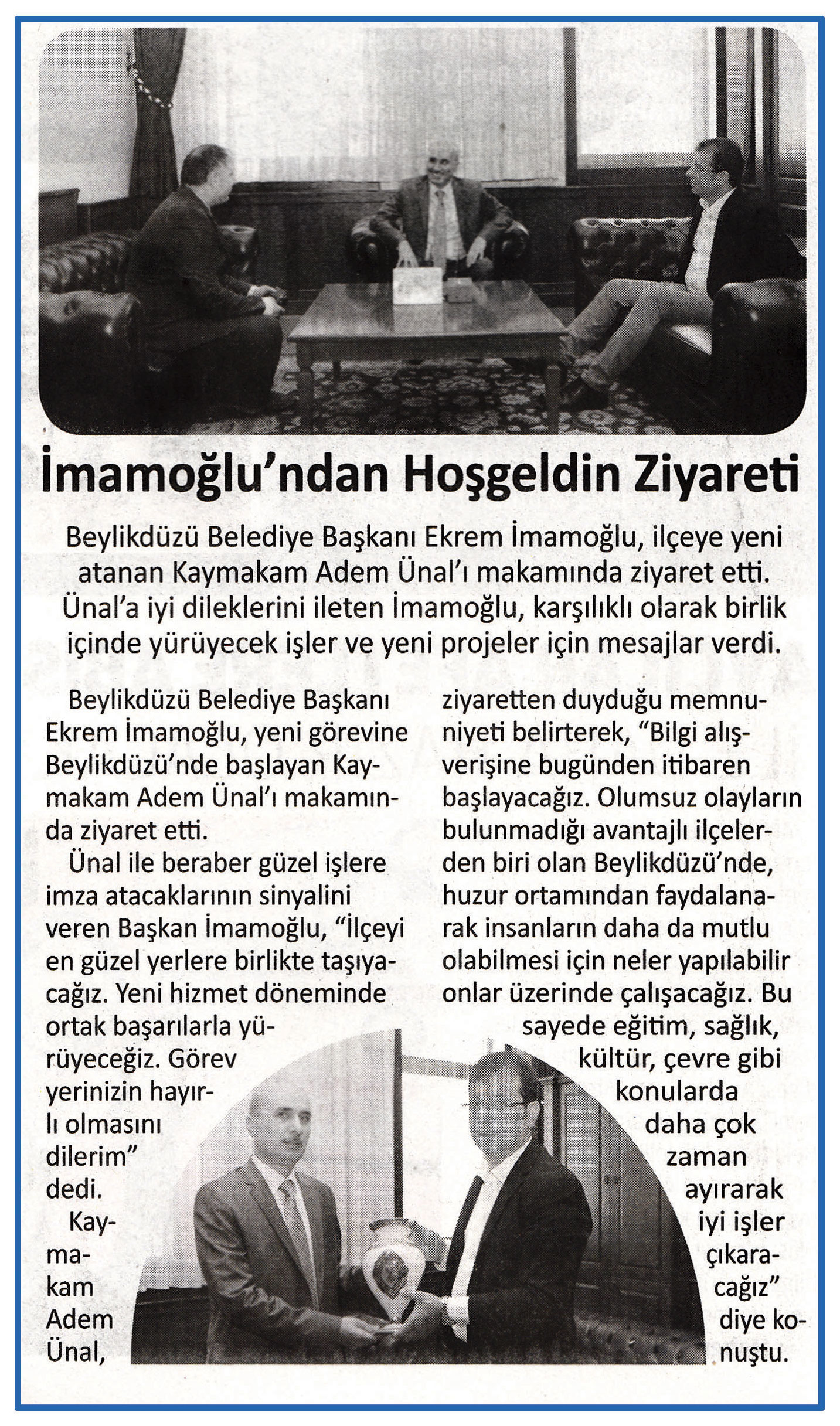 18 ağustos 2015 tarihli ''SEMTHABER'' gazetesi. Beylikdüzü Belediye Başkanı Ekrem İmamoğlu, ilçeye yeni atanan Kaymakam Adem Ünal'ı makamında ziyaret etti. Ünal'a iyi dileklerini ileten İmamoğlu, karşılıklı olarak birlik içinde yürüyecek işler ve yeni projeler için mesajlar verdi.