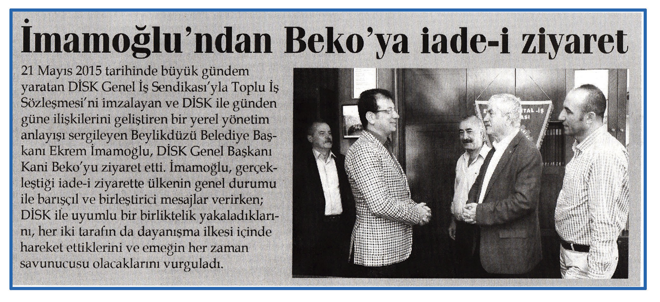 19 ağustos 2015 tarihli ''HÜRBAKIŞ'' gazetesi. 21 Mayıs 2015 tarihinde büyük gündem yaratan DİSK Genel İş Sendikası'yla Toplu İş Sözleşmesi'ni imzalayan ve DİSK Genel Başkanı Kani Beko'yu ziyaret etti.