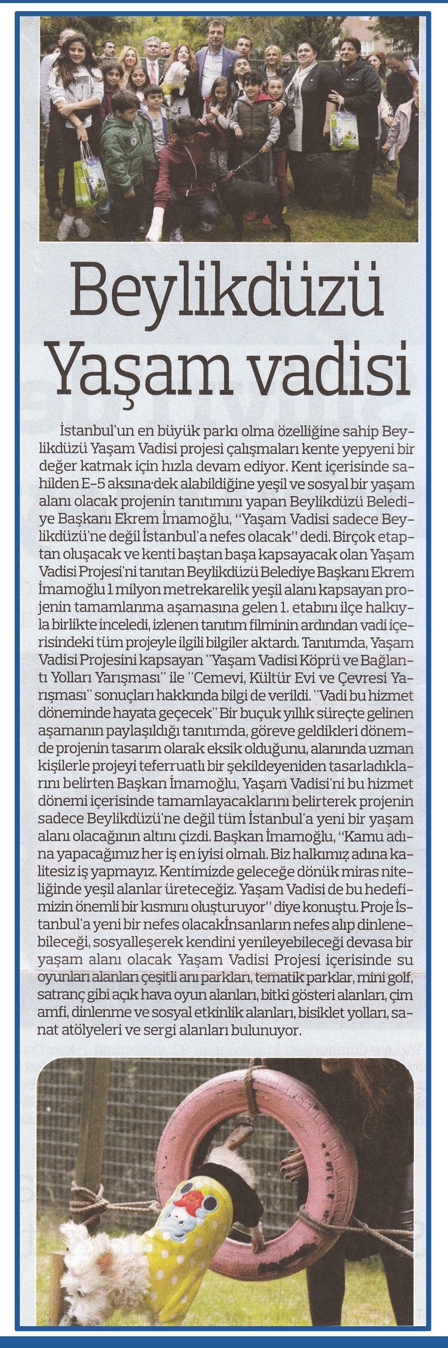 6 Kasım 2015 tarihli "BİZİMYAŞAM" gazetesi. İstanbul'un en büyük parkı olma özelliğine sahip Beylikdüü Yaşam Vadisi projesi çalışmaları kente yepyeni bir değer katmak için hızla devam ediyor.