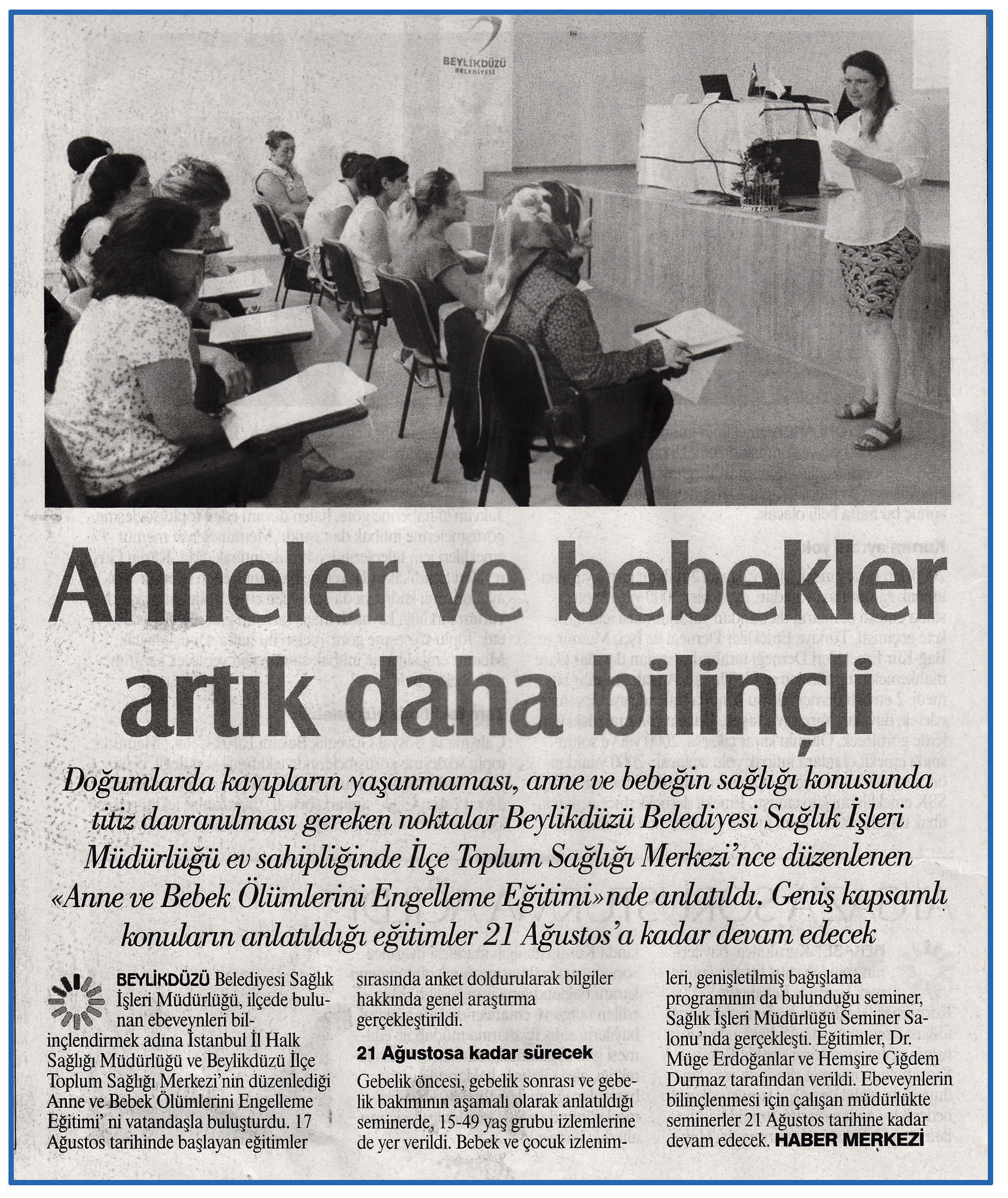 20 ağustos 2015 tarihli ''GAZETE İSTANBUL'' gazetesi. Beylikdüzü Belediyesi Sağlık İşleri Müdürlüğü,iilçede bulunan ebeveynleri bilinçlendirmek adına İstanbul İl Halk Sağlığı Müdürküğü ve Beylikdüzü İlçe Toplum Sağlığı Merkezi'nin düzenlendiği Anne ve Bebek Ölümlerini Engelleme Eğitimi'ni vatandaşla buluşturdu.