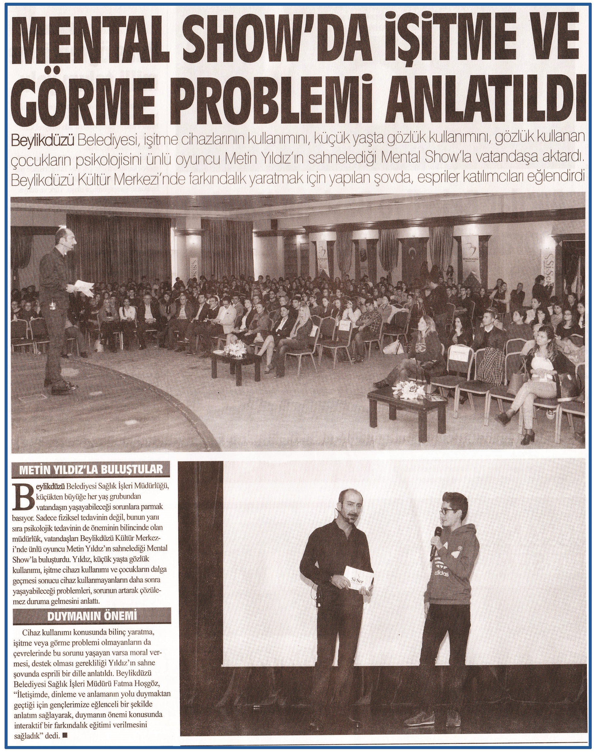 6 Kasım 2015 tarihli "YANKI" gazetesi. Beylikdüzü Belediyesi, işitme cihazlarının kullanımını, küçük yaşta gözlük kullanımı, gözlük kullanan çocukların psikolojisini ünlü oyuncu Metin Yıldız'ın sahnelediği Mental Show'la vatandaşa aktardı.