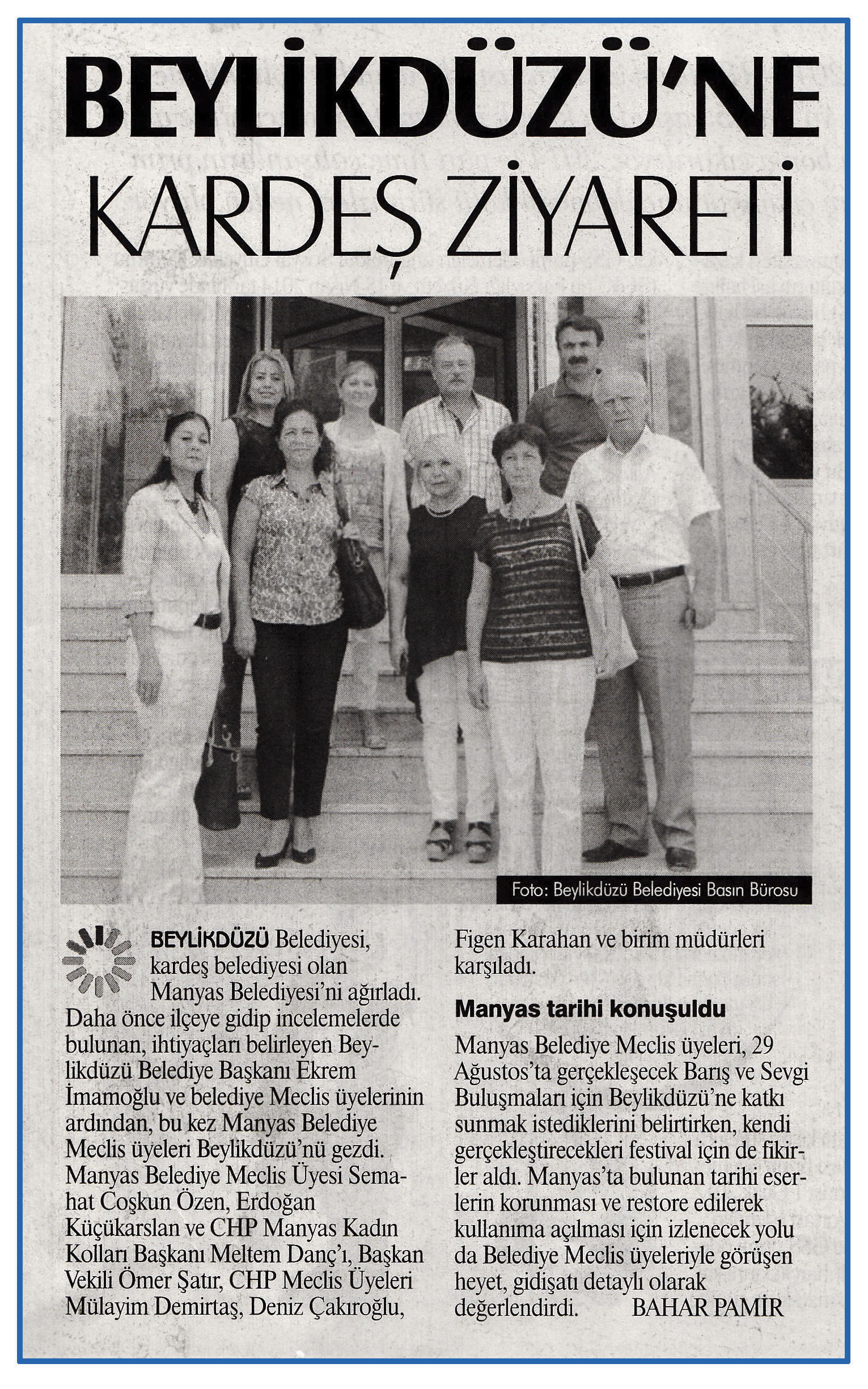 24 ağustos 2015 tarihli ''GAZETE İSTANBUL'' gazetesi. Beylikdüzü Belediyesi,kardeş belediyesi olan Manyas Belediyesi'ni ağırladı.Daha önce ilçeye gidip incelemelerde bulunan, ihtiyaçları belirleyen Beylikdüzü Belediye Bşakanı Ekrem İmamoğlu ve belediye Meclis üyelerinin ardından,bu kez Manyas Belediye Meclis üyeleri Beylikdüzü'nü gezdi.