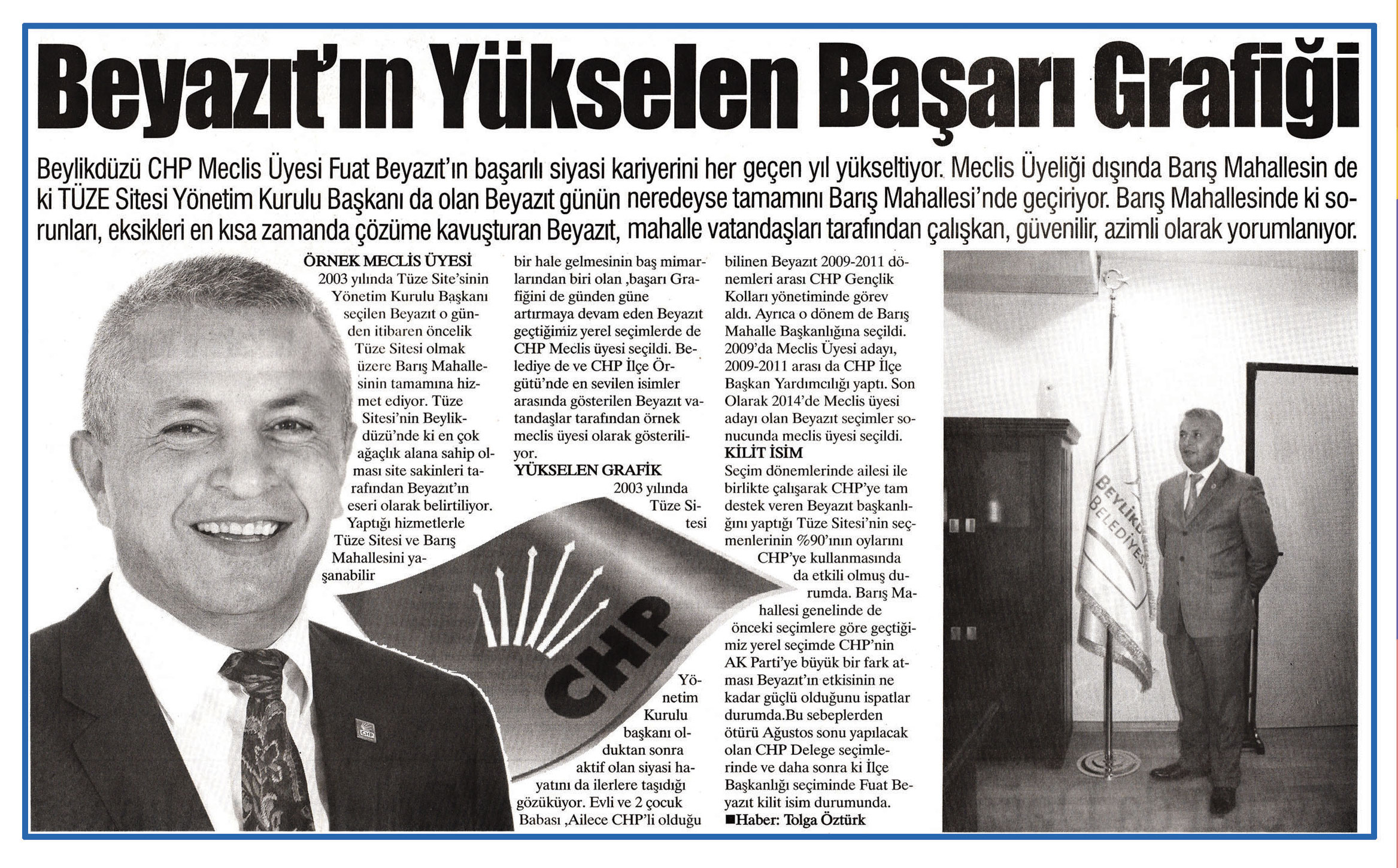 24 ağustos 2015 tarihli ''MEDYA 34'' gazetesi. Beylikdüzü CHP Meclis Üyesi Fuat Beyazıt'ın başarılı siyasi kariyerini her geçen yıl yükseltiyor.Meclis Üyeliği dışında Barış Mahallesin de TÜZE Sitesi Yönetim Kurulu Başkanı da olan Beyazıt günün neredeyse tamamını Barış Mahallesi'nde geçiriyor.Barış Mahallesinde ki sorunları,eksikleri en kısa zamanda çözüme kavuşturan Beyazıt,mahalle vatandaşları tarafından , güvenilir azimli olarak yorumlanıyor.