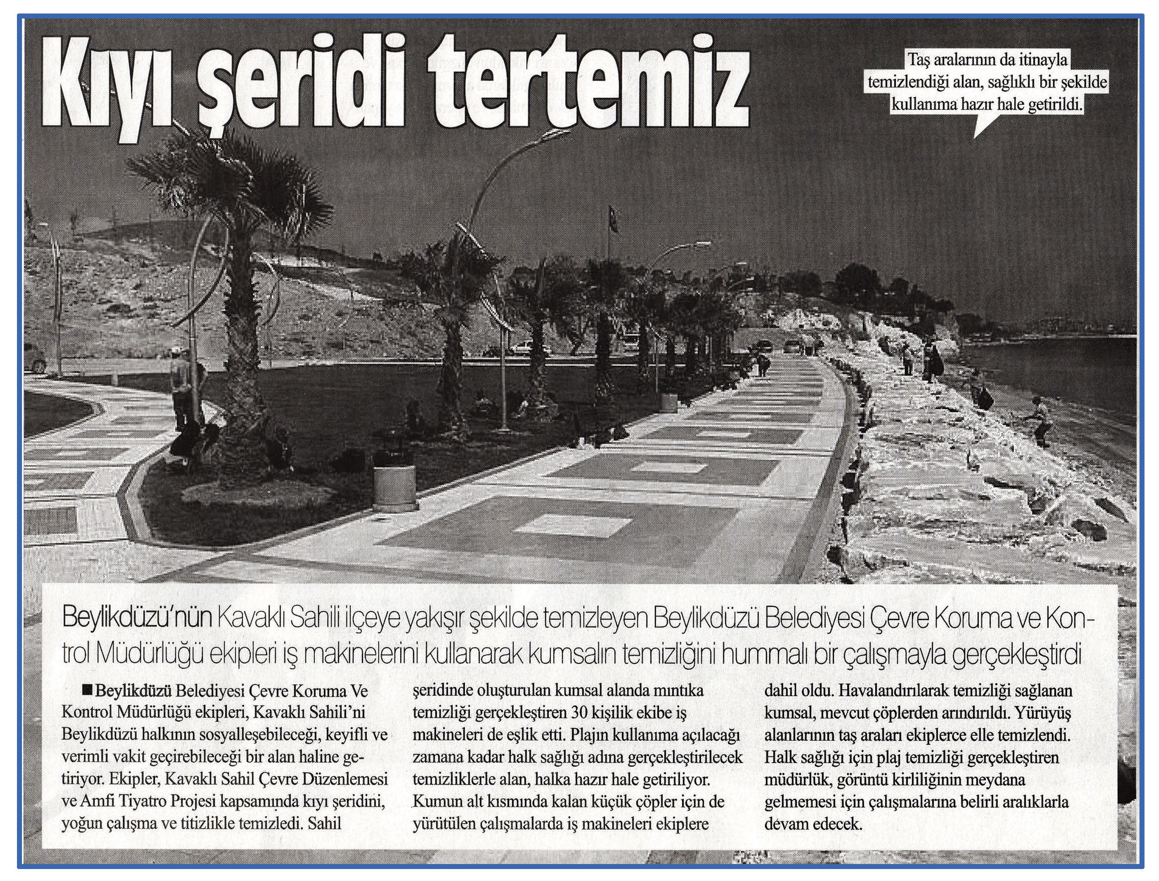 26 ağustos 2015 tarihli ''ANAHABER'' gazetesi. Beylikdüzü Belediyesi Çevre Koruma ve Kontrol Müdürlüğü ekipleri,Kavaklı Sahili'ni Beylikdüzü halkının sosyalleşebileceği,keyifli ve verimli vakit geçirebileceği bir alan haline getiriyor.