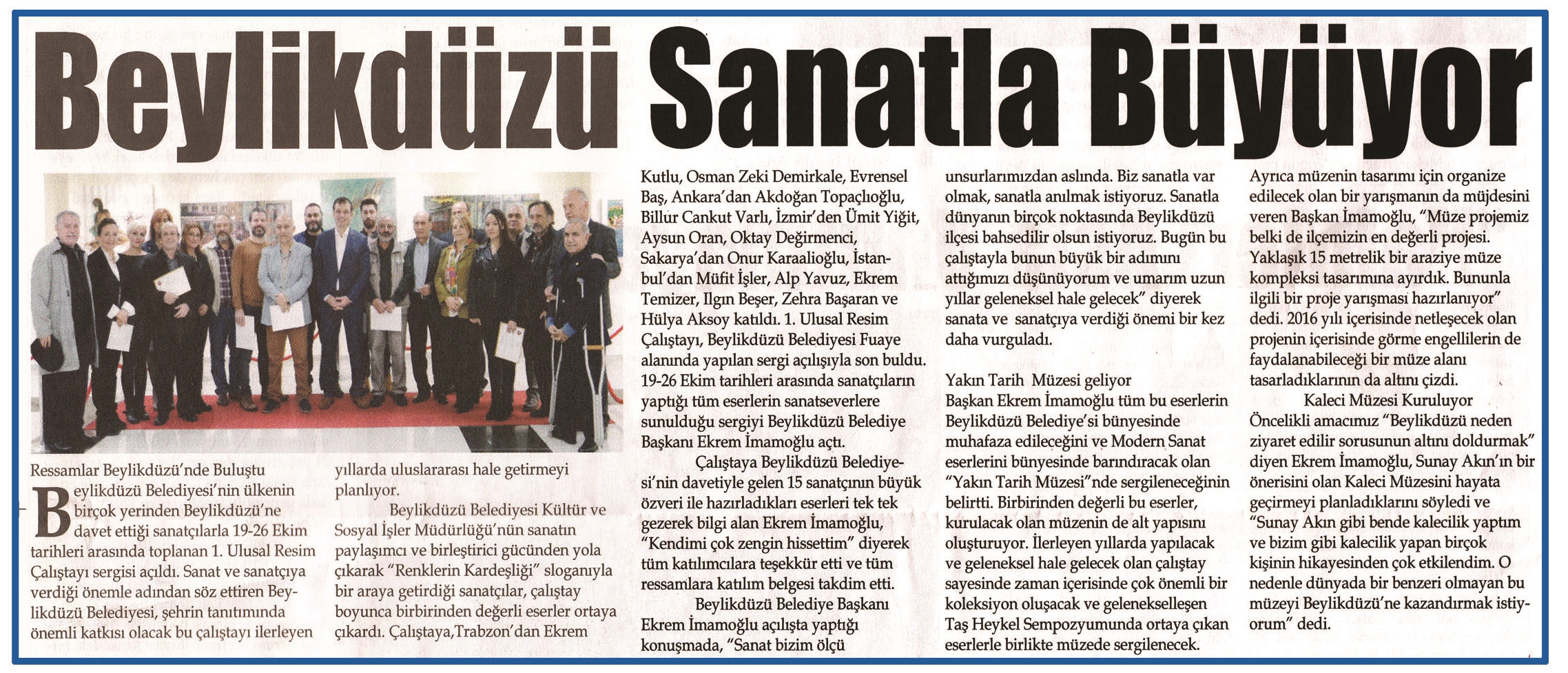 10 Kasım 2015 tarihli "BEYLİKDÜZÜ" gazetesi. Beylikdüzü Belediyesi'nin ülkenin birçok yerinden Beylikdüzü'ne davet ettiği sanatçılarla 19-26 Ekim tarihleri arasında toplanan 1. Ulusal Resim Çalıştayı sergisi açıldı.