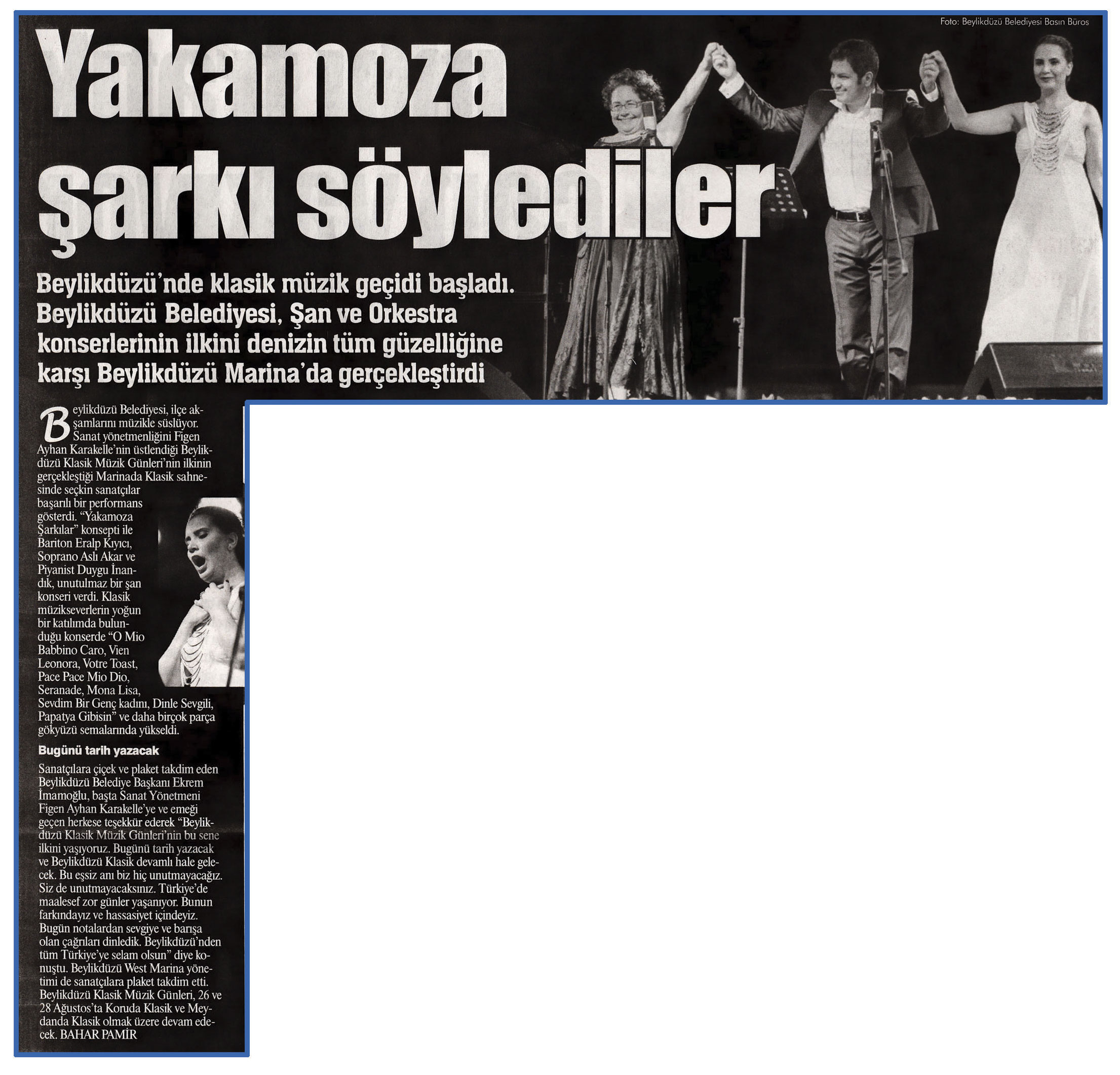 26 ağustos 2015 tarihli ''GAZETE İSTANBUL'' gazetesi. Beylikdüzü'nde klasik müzik geçidi başladı.Beylikdüzü Belediyesi,Şan ve Orkestra konserlerinin ilkini denizin tüm güzelliğine karşı Beylikdüzü Marina'da gerçekleştirdi.