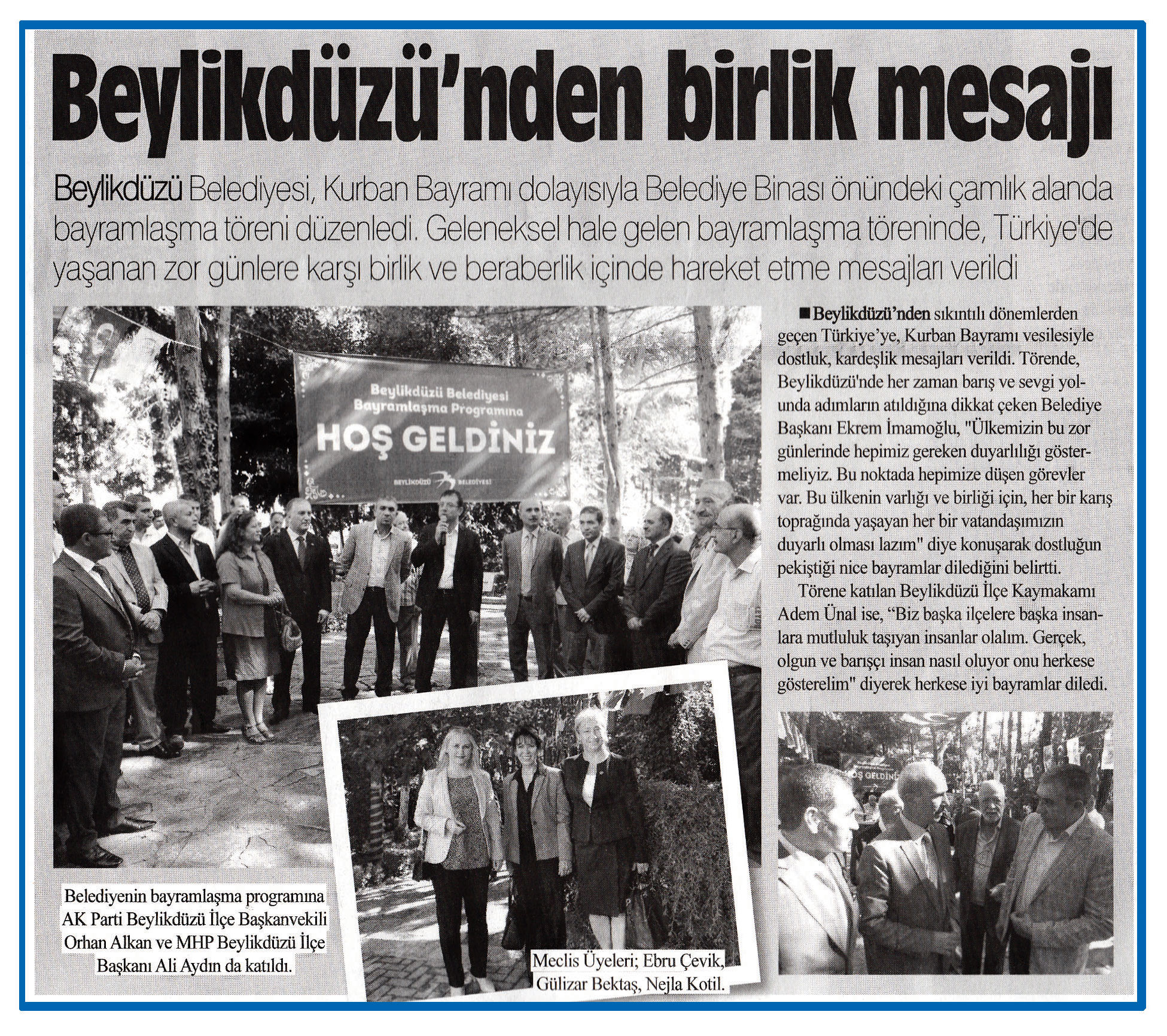 5 Ekim 2015 tarihli "YENİ SAYFA" gazetesi.Beylikdüzü Belediyesi, Kurban Bayramı dolayısıyla Belediye Binası önündeki çamlık alanda bayramlaşma töreni düzenledi. Geleneksel hale gelen bayramlaşma töreninde, Türkiye'de yaşanan zor günlere karşı birlik ve beraberlik içinde hareket etme mesajları verildi