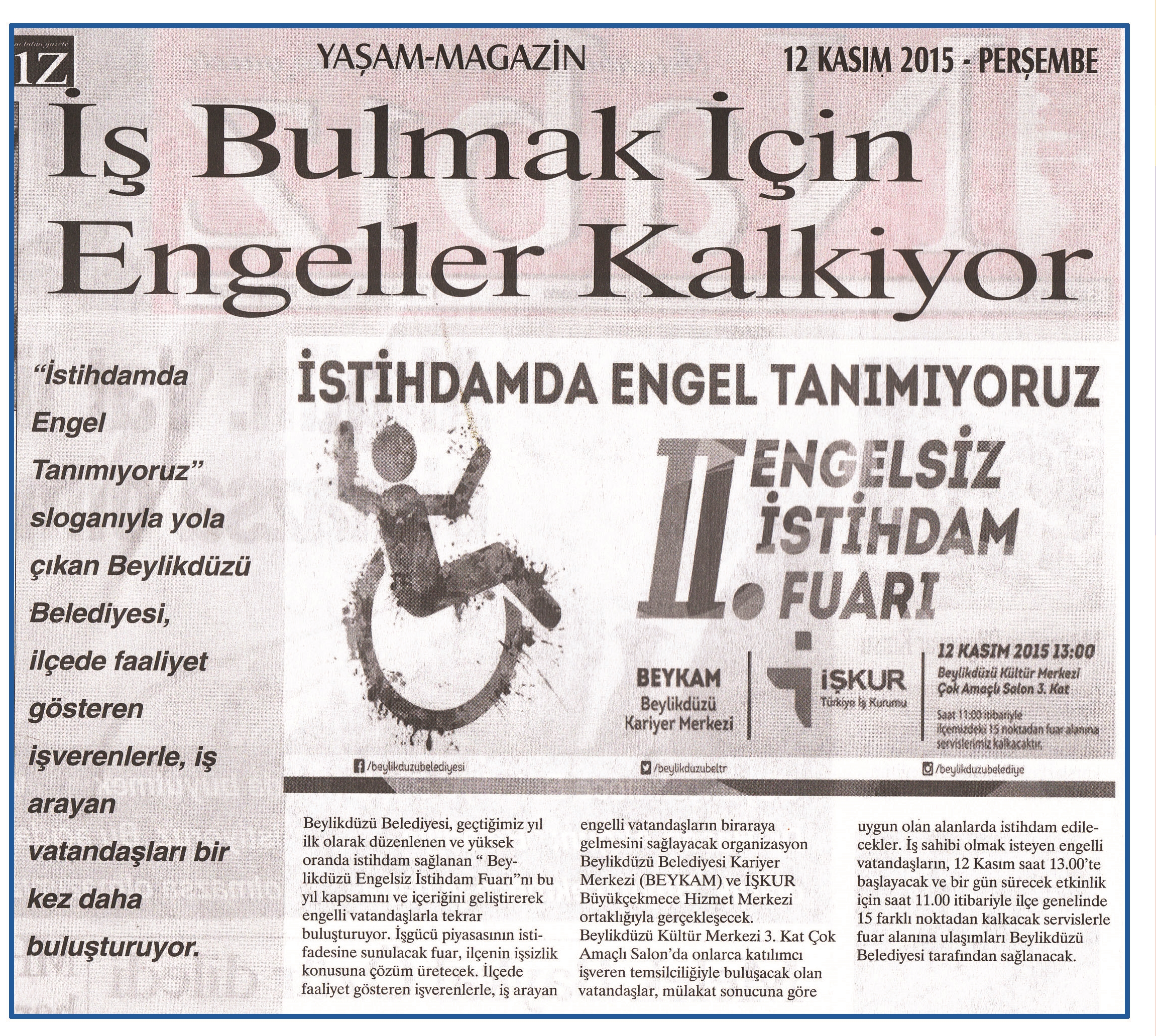 12 Kasım 2015 tarihli "NABIZ" gazetesi. "İstihdamda Engel Tanımıyoruz" sloganıyla yola çıkan Beylikdüzü Belediyesi, ilçede faaliyet gösteren işverenlerle, iş arayan vatandaşları bir kez daha buluşturuyor.