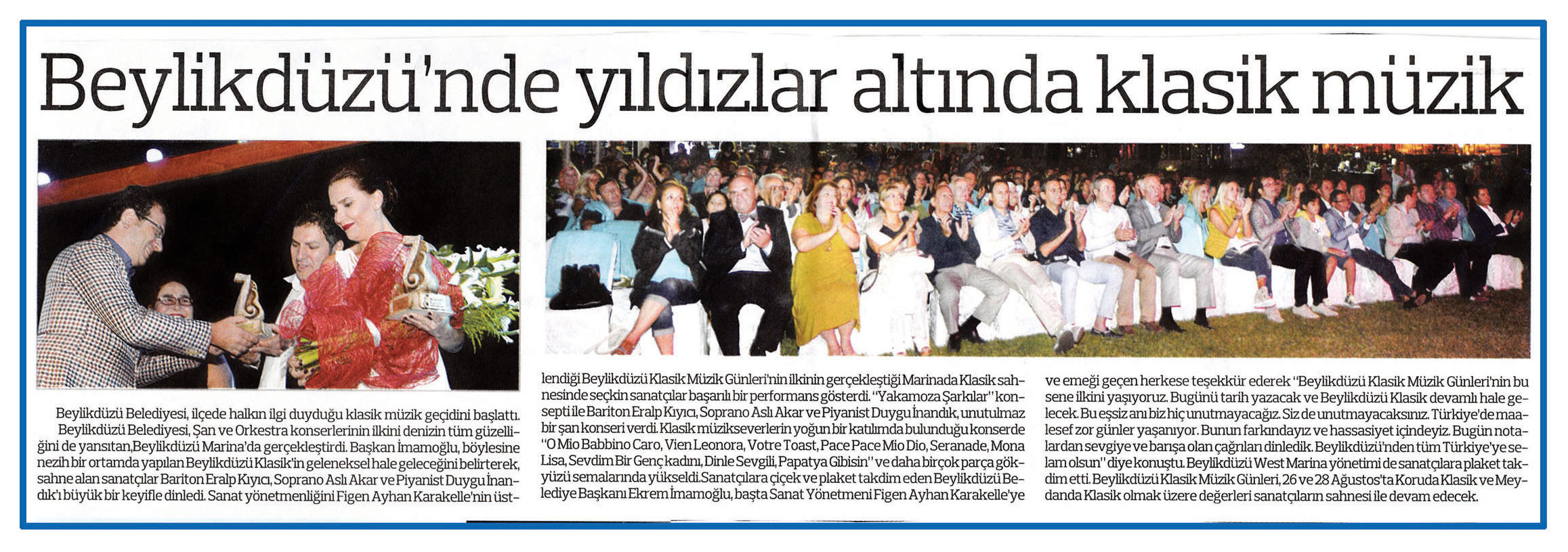 1 eylül 2015 tarihli ''BİZİMYAŞAM'' gazetesi. Beylikdüzü Belediyesi,ilçede halkın ilgi duyduğu klasik müzik geçidini başlattı.Beylikdüzü Belediyesi,Şan ve Orkestra konserlerinin ilkini denizin tüm güzelliğini de yansıtan,Beylikdüzü Marina'da gerçekleştirdi.