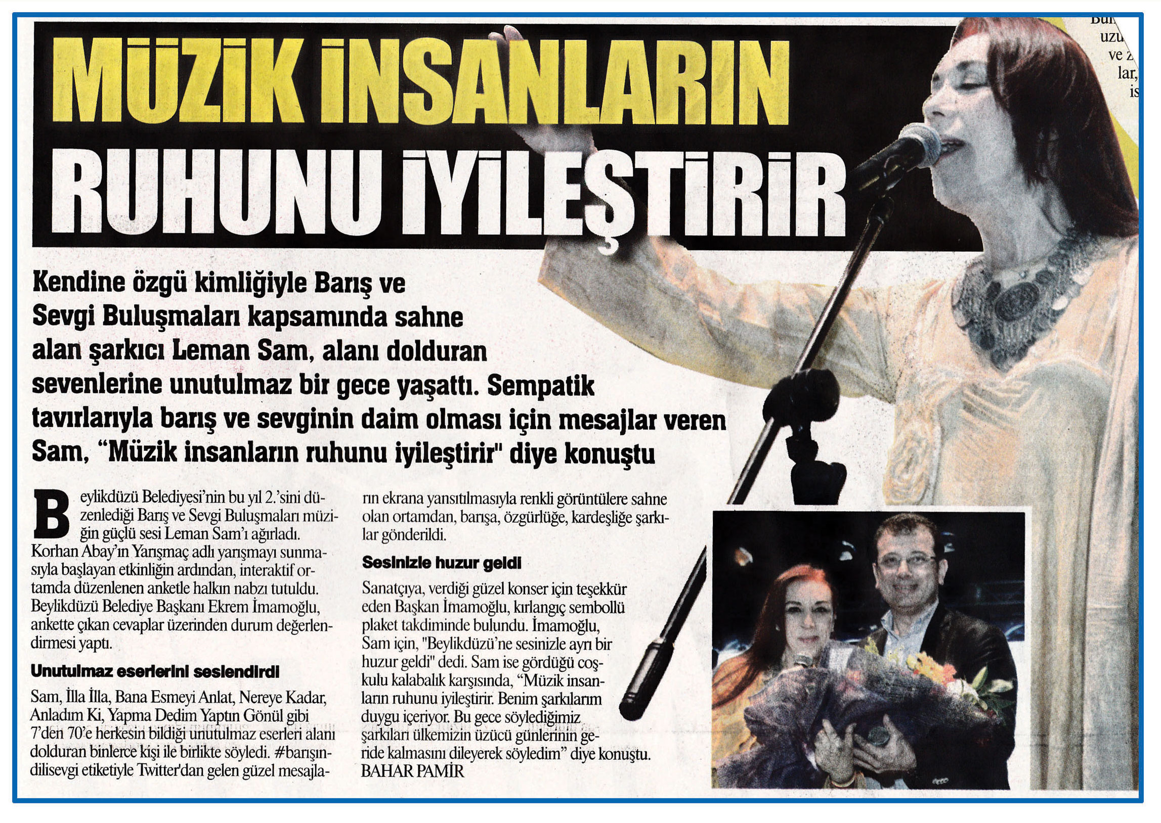 2 eylül 2015 tarihli ''GAZETE İSTANBUL'' gazetesi. Kendine özgü kimliğiyle Barış ve Sevgi Buluşmaları kapsamında sahne alan şarkıcı Leman Sam,alanı dolduran sevenlerine unutulmaz bir gece yaşattı.Sempatik tavırlarıyla barış ve sevginin daim omlası için mesajlar veren Sam, ''Müzik insanların ruhunu iyileştirir'' diye konuştu.