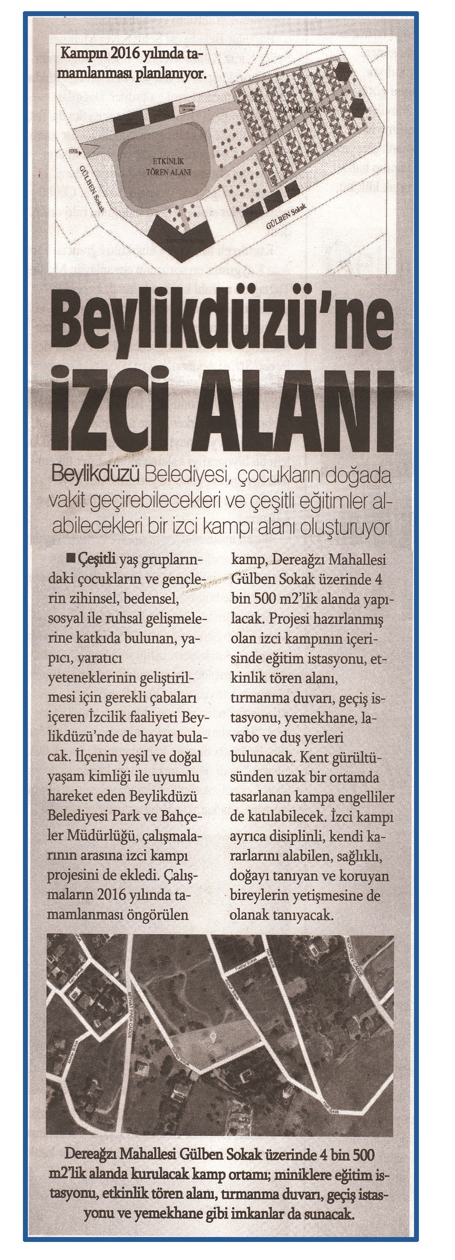 13 Kasım 2015 tarihli "YANKI" gazetesi. Beylikdüzü Belediyesi, çocukların doğada vakit geçirebilecekleri ve çeşitli eğitimler alabilecekleri bir izci kampı alanı oluşturuyor.