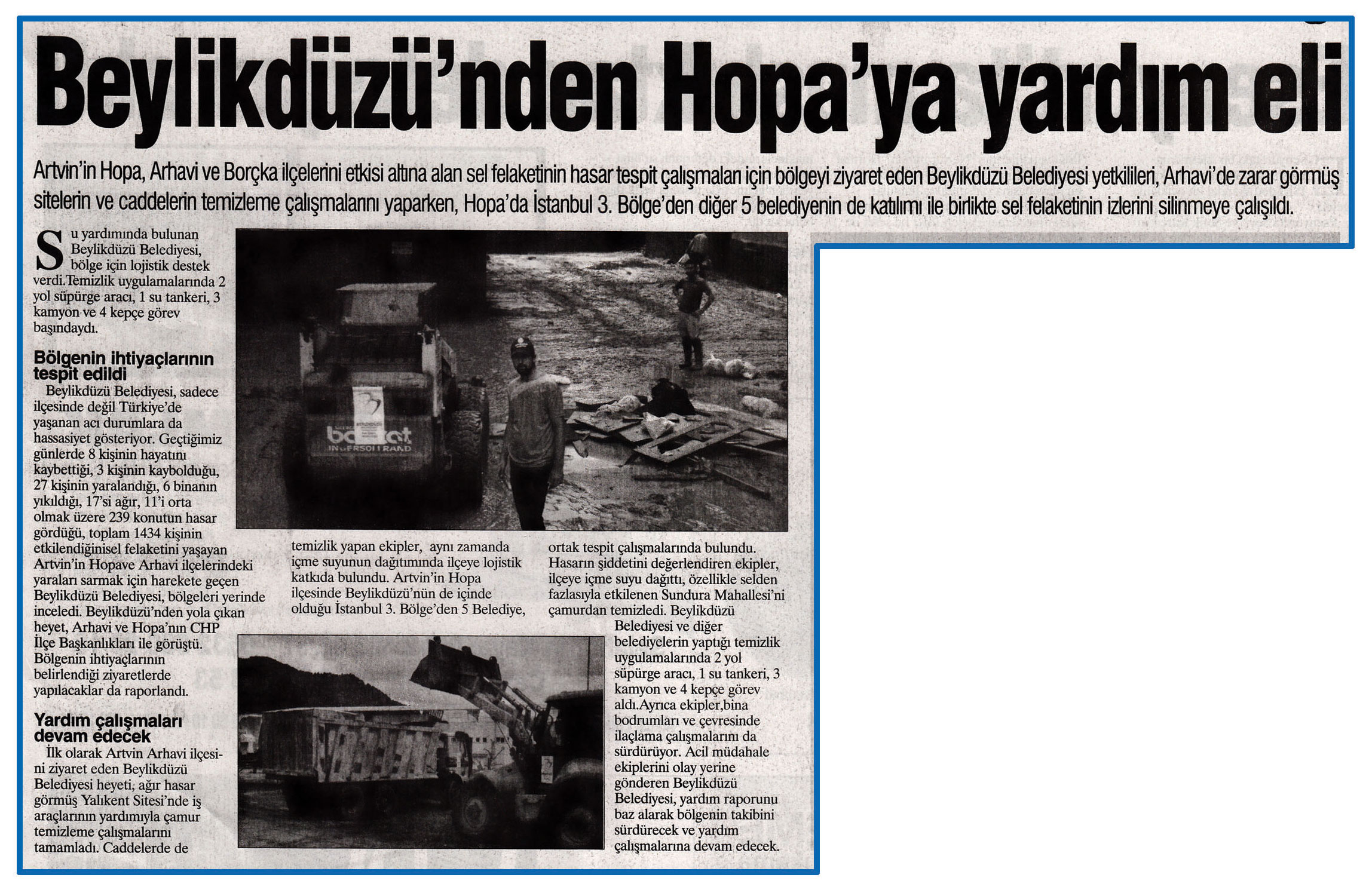 2 eylül 2015 tarihli ''KENT HABER'' gazetesi. Artvin'in Hopa,Arhavi ve Borçka ilçelerini etkisi altına alan sel felaketinin hasar tespit çalışmaları için bölgeyi ziyaret eden Beylikdüzü Belediyesi yetkilileri,Arhavi'de zarar görmüş sitelerin ve caddelerin temizleme çalışmalarını yaparken,Hopa'da İstanbul 3. Bölge'den diğer 5 belediyenin de katılımı ile birlikte sel felaketinin izlerini silmeye çalıştı.