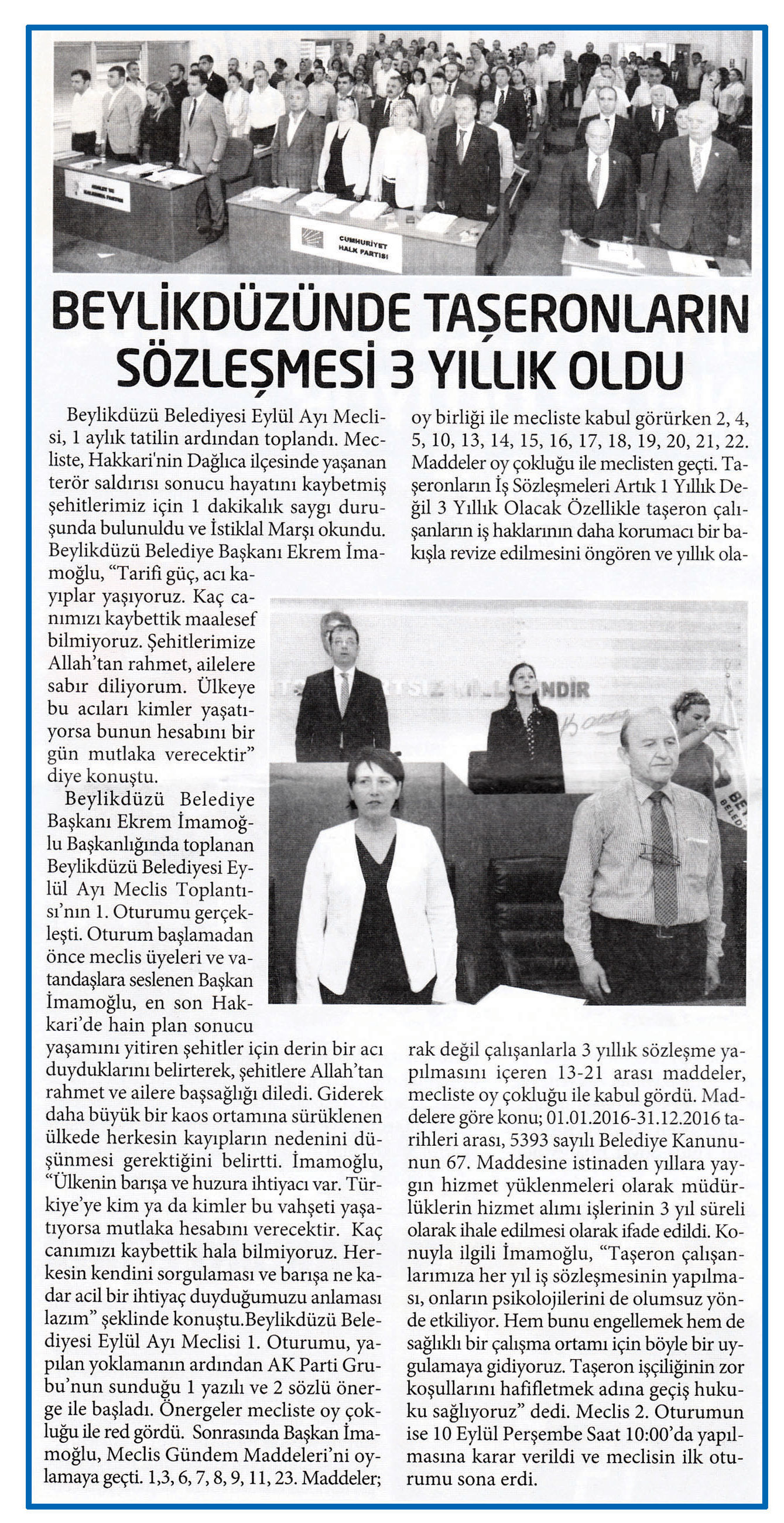 5 Ekim 2015 tarihli " YEREL MEDYA" gazetesi. Beylikdüzü Belediyesi Eylül Ayı Meclisi, 1 aylık tatilin ardından toplandı. Eylül Ayı Meclisi 1.Oturumu, yapılan yoklamanın ardından AK Parti Grubu'nun sunduğu 1 yazılı ve 2 sözlü önerge ile başladı. Taşeronların İş Sözleşmeleri artık 1 yıllık değil 3 yıllık olacak. Özellikle taşeron çalışanların iş haklarının daha korumacı bir bakışla revize edilmesini öngören ve yıllık olarak değil 3 yıllık sözleşme yapılmasını içeren 14-21 arası maddeleri mecliste oy çokluğu ile kabul gördü.