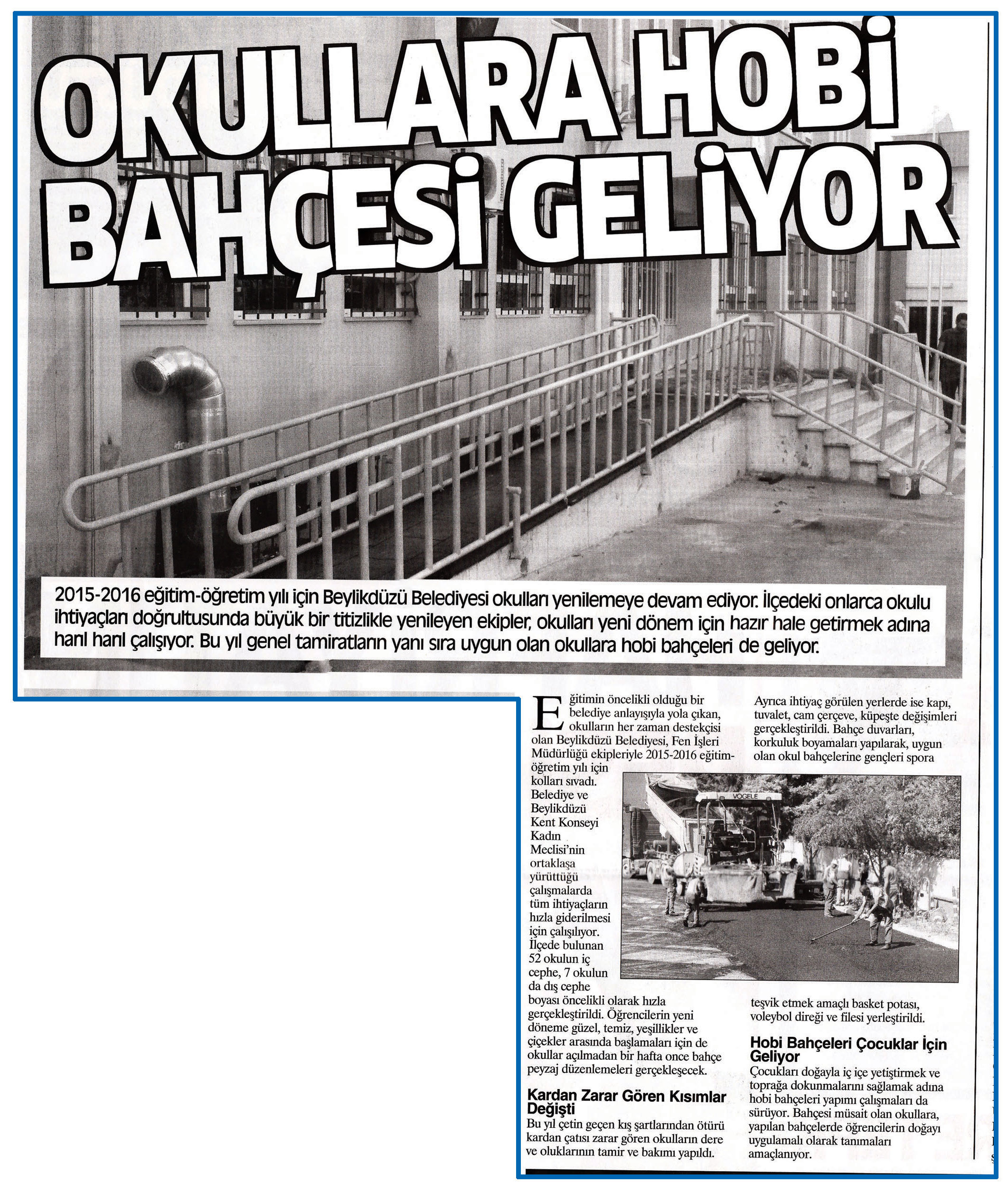 9 eylül 2015 tarihli ''HABER EKSPRESS'' gazetesi. 2015-2016 eğitim-öğretim yılı için Beylikdüzü Belediyesi okulları yenilemeye devam ediyor.İlçedeki onlarca okulu ihtiyaçları doğrultusunda büyük bir titizlikle yenileyen ekipler,okulları yeni dönem için hazır hale getirmek adına harıl harıl çalışıyor.Bu yıl genel tamiratların yanı sıra uygun olan okullara hobi bahçeleri de geliyor.