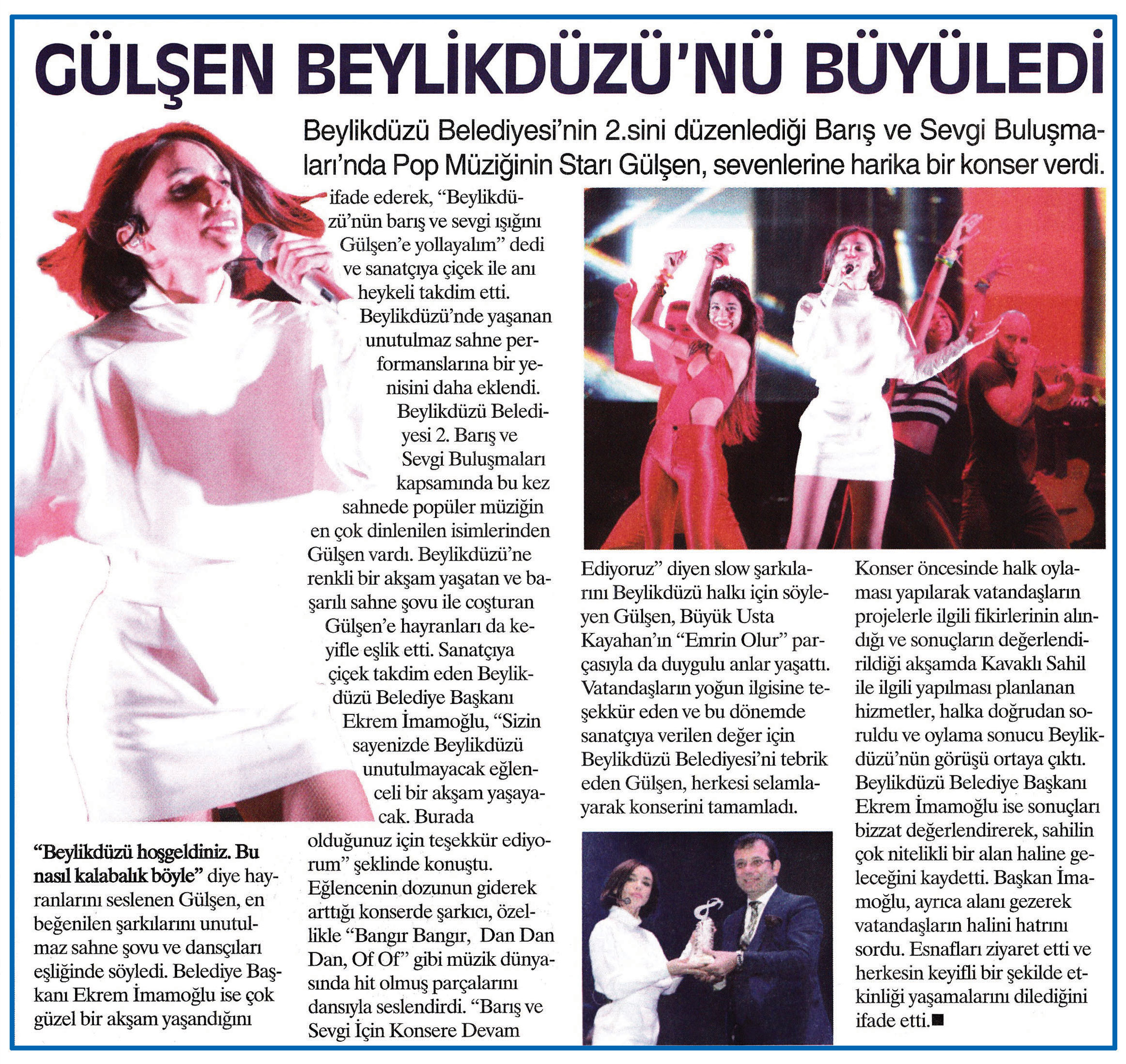 19 eylül 2015 tarihli ''BEYLİKDÜZÜ'' gazetesi. Beylikdüzü Belediyesi'nin 2.sini düzenlediği Barış ve Sevgi Buluşmaları'nda Pop Müziğinin Starı Gülşen,sevenlerine harika bir konser verdi.