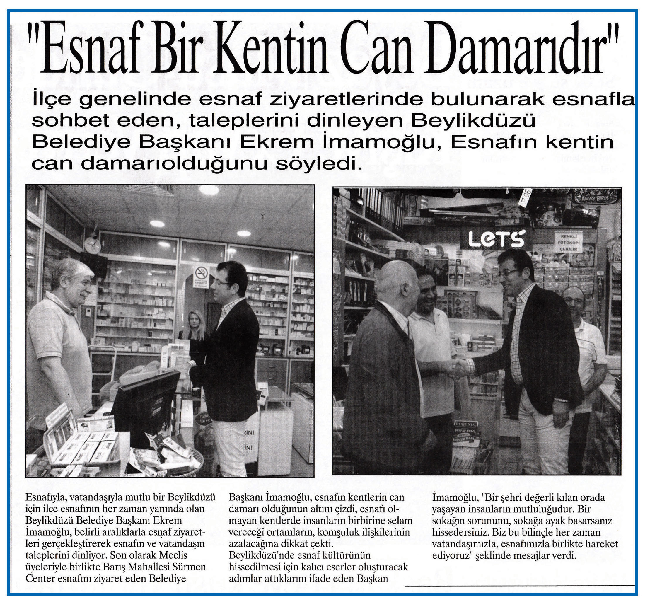 7 Ekim 2015 tarihli "NABIZ" gazetesi. İlçe genelinde esnaf ziyaretlerinde bulunarak esnafla sohbet eden, taleplerini dinleyen Beylikdüzü Belediye Başkanı Ekrem İmamoğlu, esnafın kentin can damarı olduğunu söyledi.