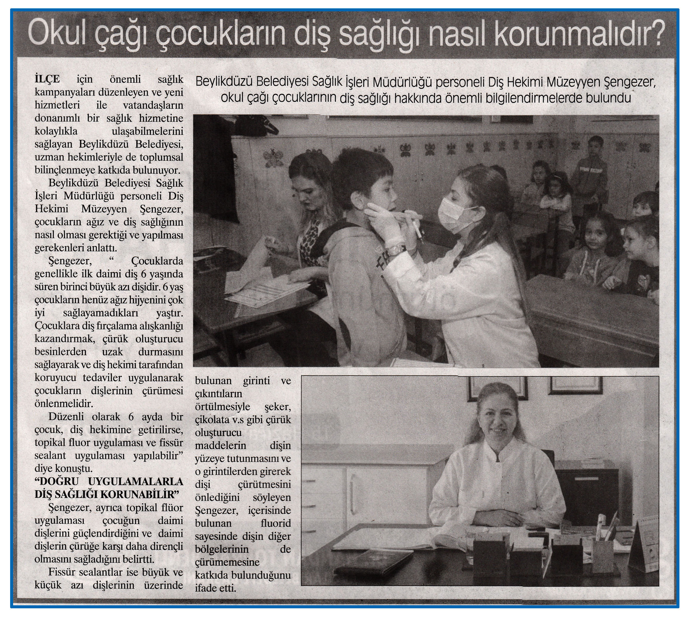 12 Ekim 2015 tarihli "DEĞİŞİM" gazetesi. Beylikdüzü Belediyesi Sağlık İşleri Müdürlüğü personeli diş hekimi Müzeyyen Şengezer, okul çağı çocuklarının diş sağlığı hakkında önemli bilgilendirmelerde bulundu.