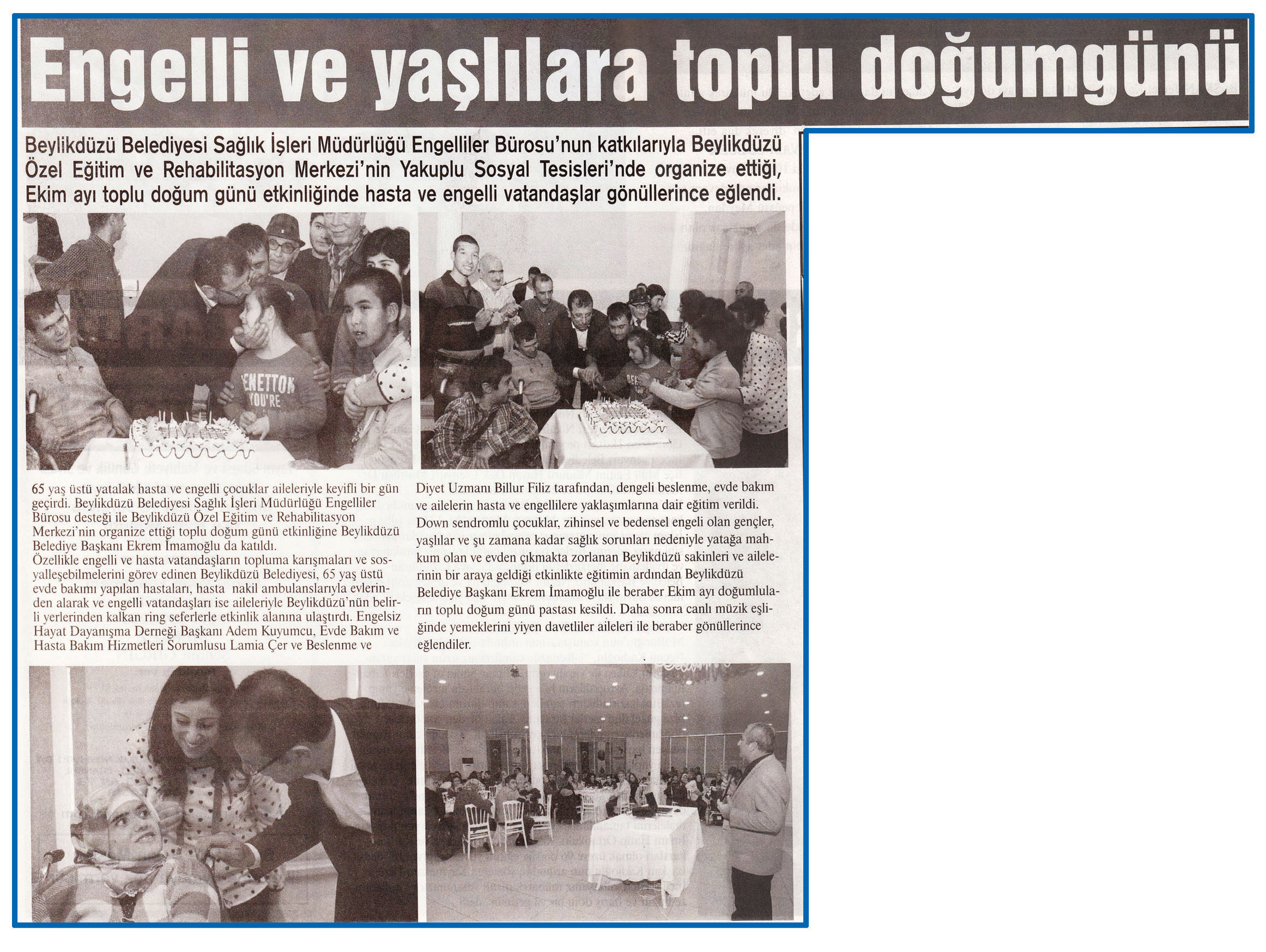 16 Ekim 2015 tarihli "MARMARA" gazetesi. Beylikdüzü Belediyesi Sağlık İşleri Müdürlüğü Engelliler Bürosu'nun katkılarıyla Beylikdüzü Özel Eğitim ve Rehabilitasyon Merkezi'nin Yakuplu Sosyal Tesisleri'nde organize ettiği, Ekim ayı toplu doğum günü etkinliğinde hasta ve engelli vatandaşlar gönüllerince eğlendş.