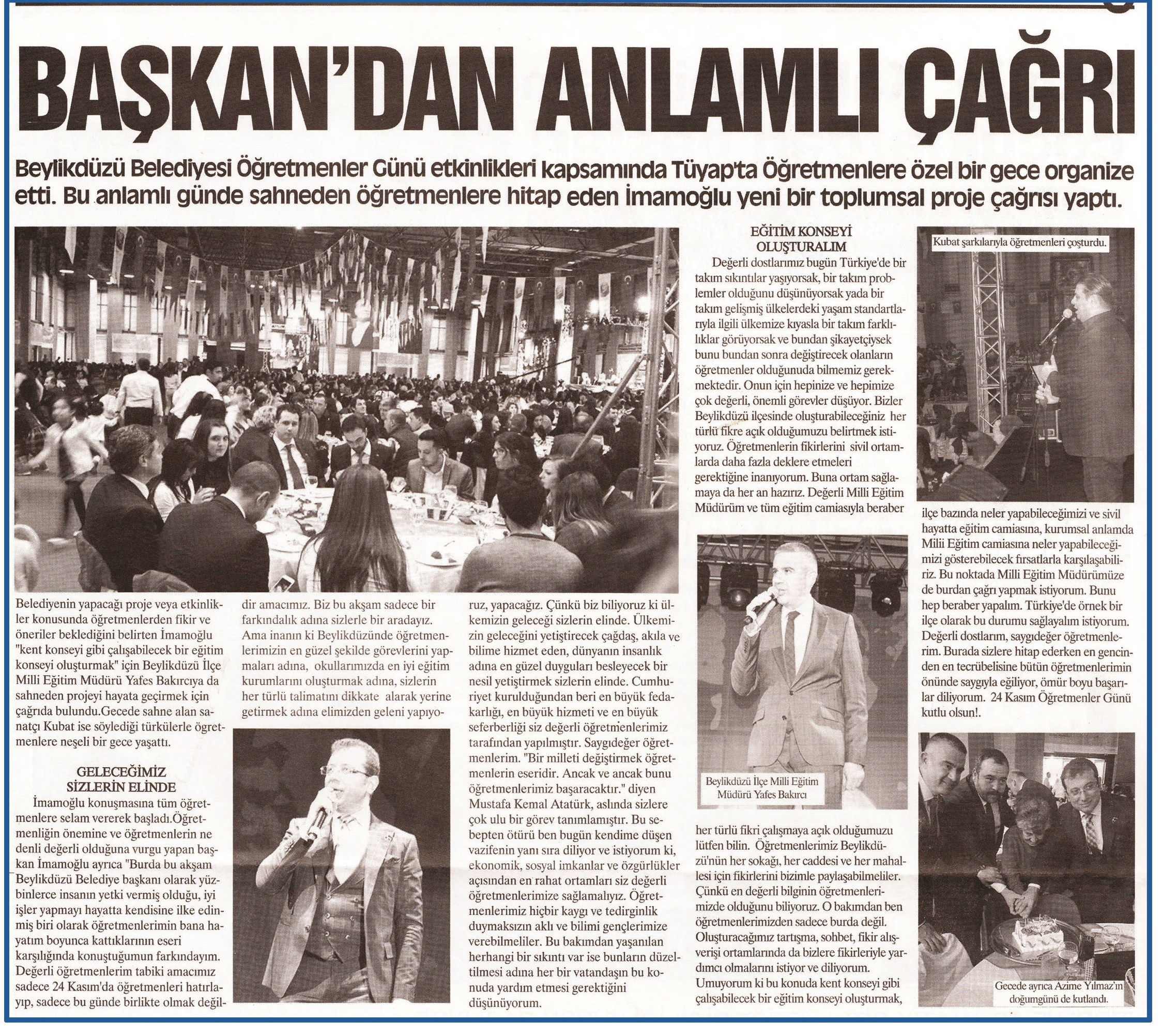 25 Kasım 2015 tarihli "GAZETE CADDE" gazetesi. Beylikdüzü Belediyesi Öğretmenler Günü etkinlikleri kapsamında Tüyap'ta Öğretmenlere özel bir gece organize etti. Bu anlamlı günde sahneden öğretmenlere hitap eden İmamoğlu yeni bir toplumsal proje çağrısı yaptı.