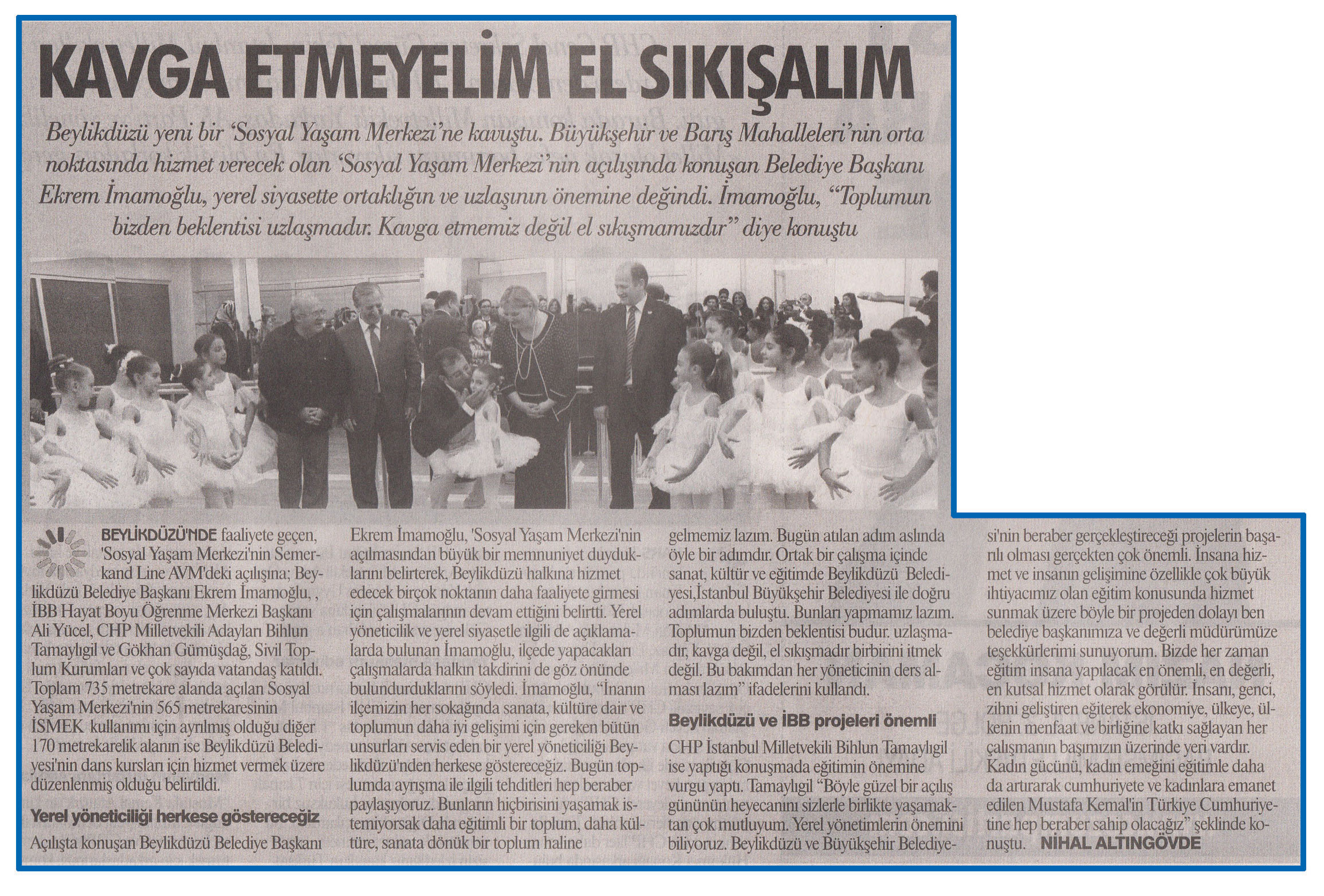 21 Ekim 2015 tarihli "GAZETE İSTANBUL" gazetesi. Beylikdüzü yeni bir "Sosyal Yaşam Merkezi"ne kavuştu. Büyükşehir ve Barış Mahalleleri'nin orta noktasında hizmet verecek olan "Sosyal Yaşam Merkezi"nin açılışında konuşan Belediye Başkanı Ekrem İmamoğlu, yerel siyasette ortaklığın ve uzlaşının önemine değindi.