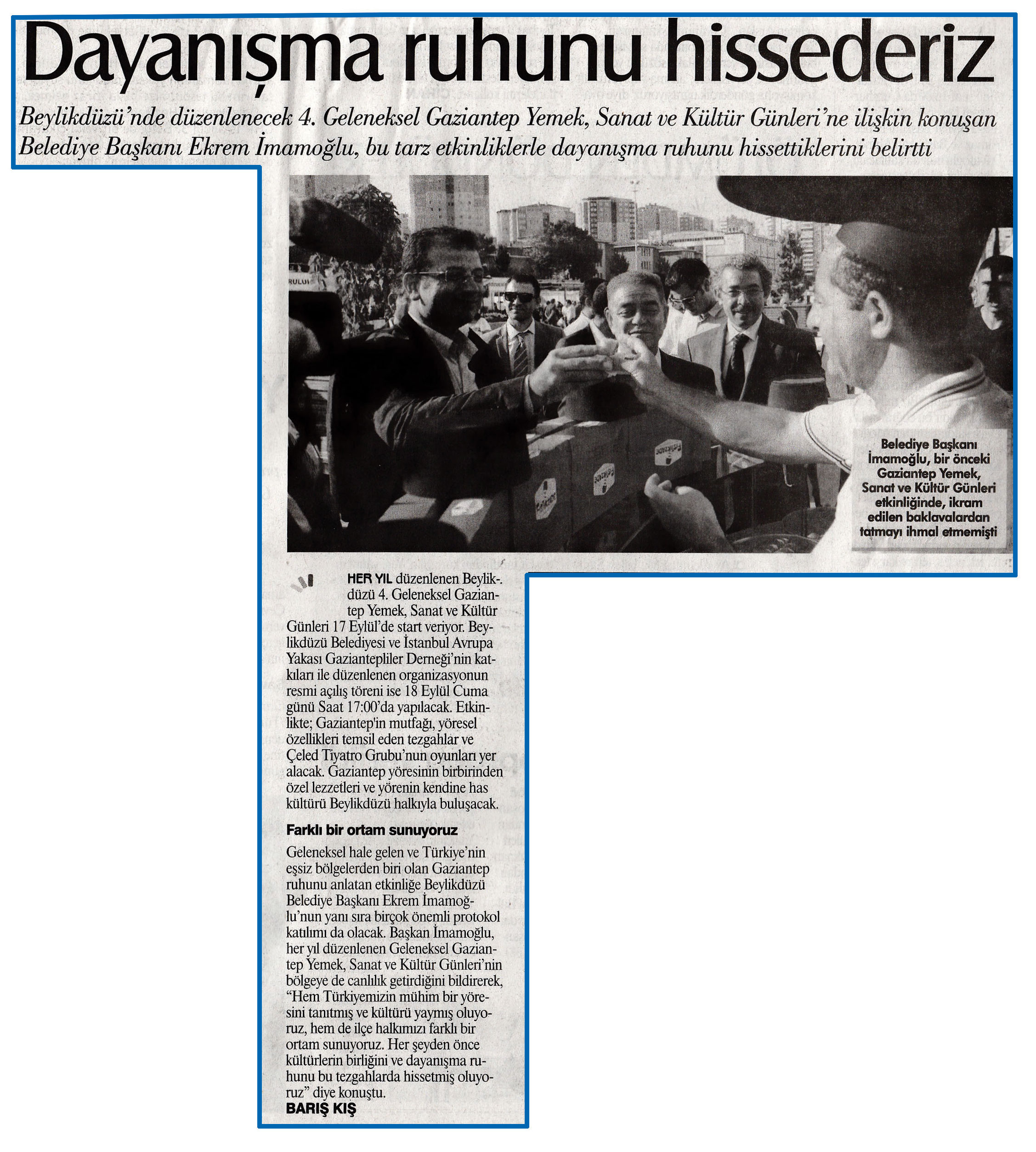 17 eylül 2015 tarihli ''GAZETE İSTANBUL'' gazetesi. Beylikdüzü'nde düzenlenecek 4. Geleneksel Gaziantep Yemek,Sanat ve Kültür Günleri'ne ilişkin konuşan Belediye Başkanı Ekrem İmamoğlu, bu tarz etkinliklerle dayanışma ruhunu hissettiklerini belirtti.