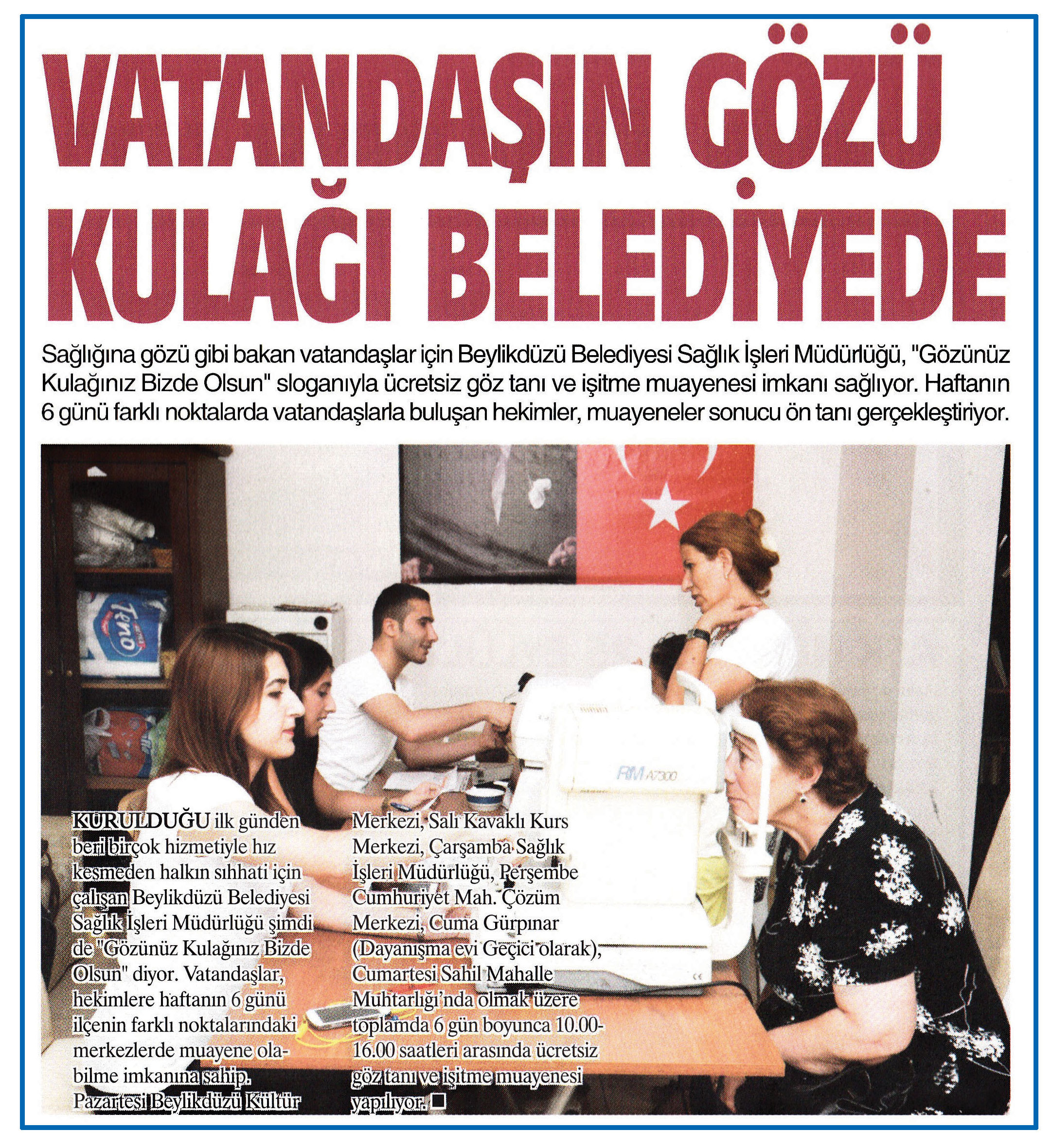 17 eylül 2015 tarihli ''ZEYNA'' gazetesi. Sağlığına gözü gibi bakan vatandaşlar için Beylikdüzü Belediyesi Sağlık İşleri Müdürlüğü, ''Gözünüz Kulağınız Bizde Olsun'' sloganıyla ücretsiz göz tanı ve işitme muayenesi imkanı sağlıyor.Haftanın 6 günü farklı noktalarda vatandaşlarla buluşan hekimler, muayeneler sonucu ön tanı gerçekleştiriyor.