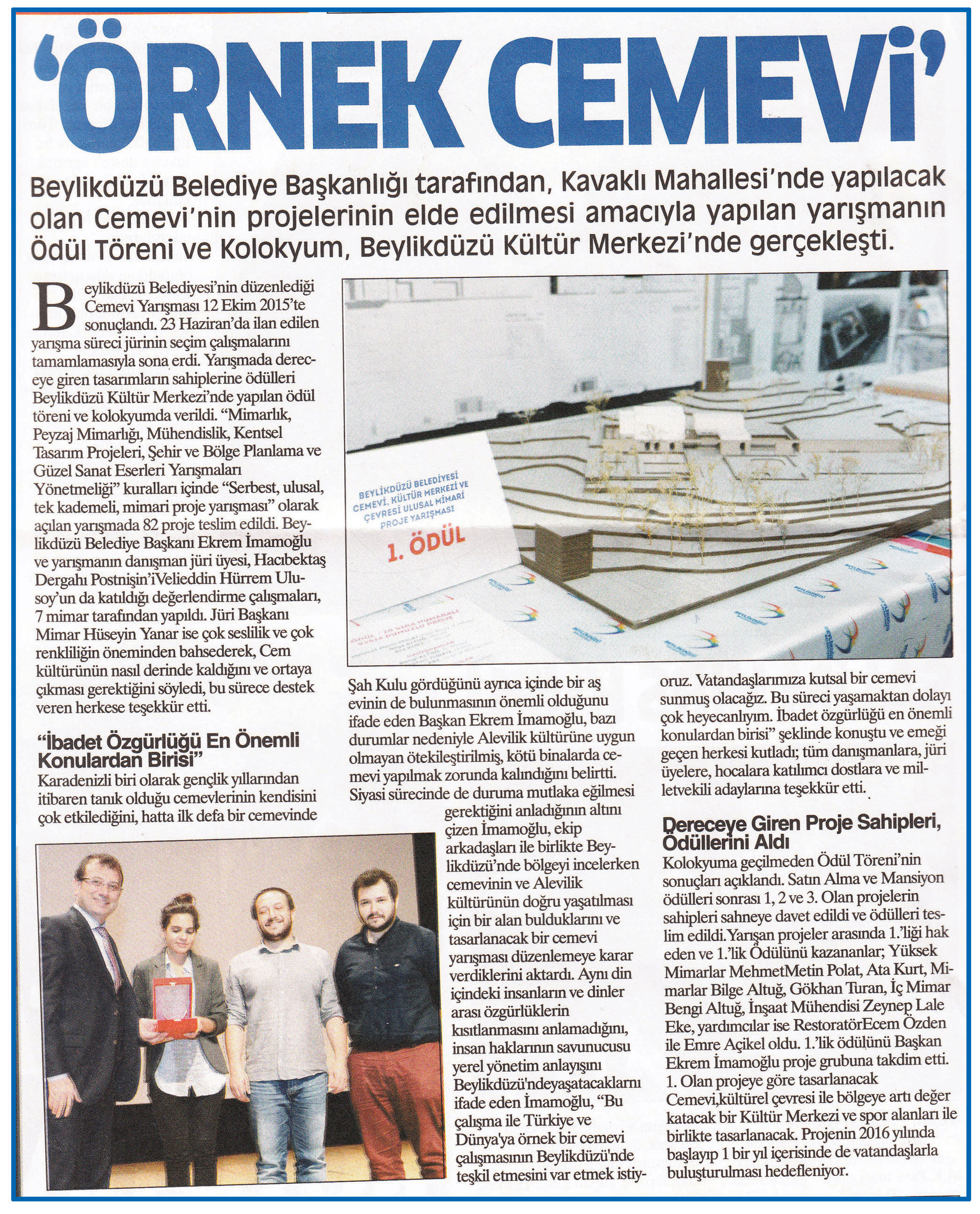 23 Ekim 2015 tarihli " HABER EKSPRESS" gazetesi. Beylikdüzü Belediye Başkanlığı tarafından, Kavaklı Mahallesi'nde yapılacak olan Cemevi'nin projelerinin elde edilmesi amcıyla yapılan yarışmanın Ödül Töreni ve Kolokyum Beylikdüzü Kültür Merkezi'nde gerçekleşti.