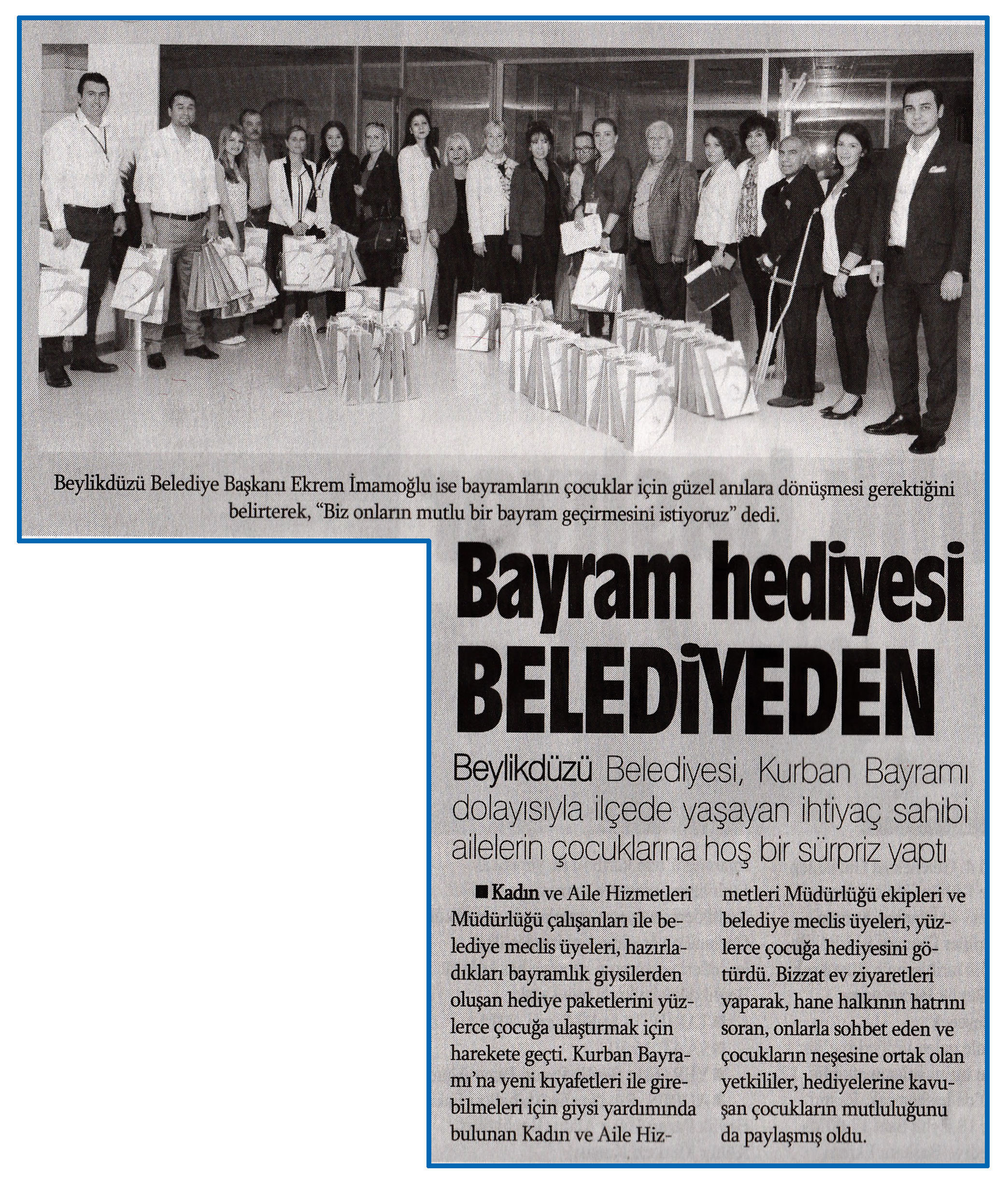 18 eylül 2015 tarihli ''YANKI'' gazetesi. Beylikdüzü Belediye Başkanı Ekrem İmamoğlu ise bayramların çocuklar için güzel anılara dönüşmesi gerektiğini belirterek, ''Biz onların mutlu bir bayram geçirmesini istiyoruz'' dedi.
