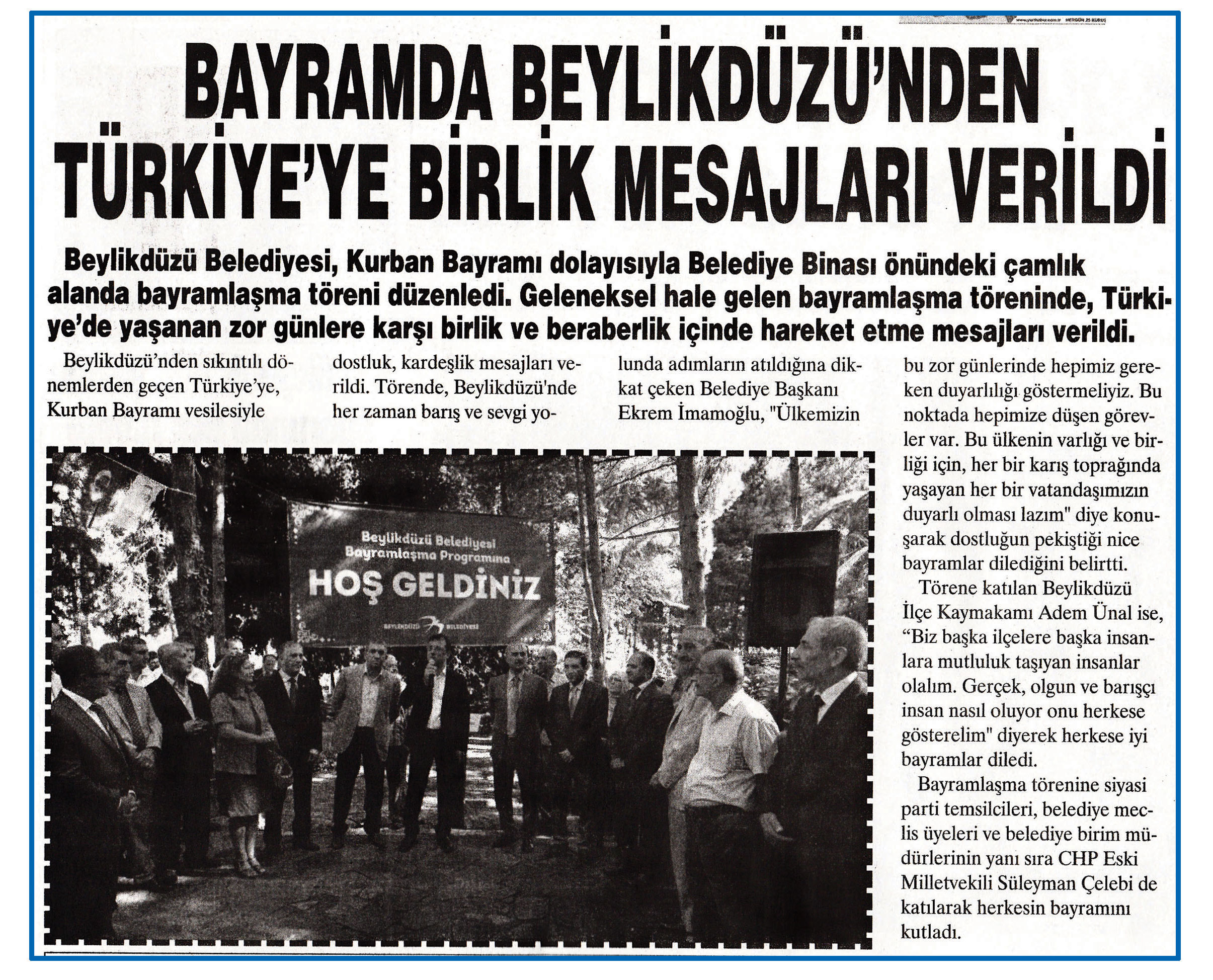 29 eylül 2015 tarihli ''YURT HABER'' gazetesi. Beylikdüzü Belediyesi,Kurban Bayramı dolayısıyla Belediye Binası önündeki çamlık alanda bayramlaşma töreni düzenledi.Geleneksel hale gelen bayramlaşma töreninde,Türkiye'de yaşanan zor günlere karşı birlik ve beraberlik içinde hareket etme mesajları verildi.