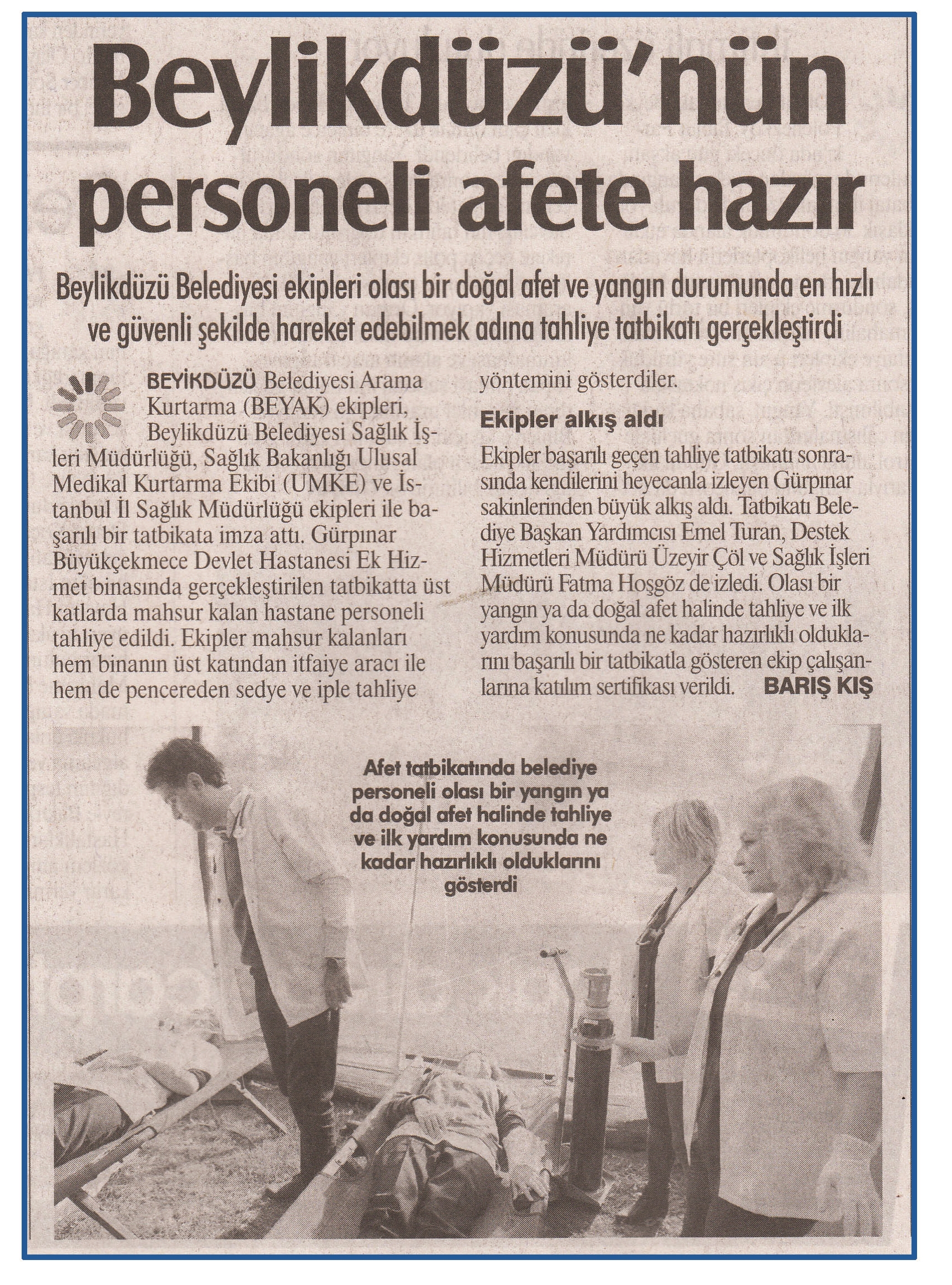 25 Kasım 2015 tarihli "GAZETE İSTANBUL" gazetesi. Beylikdüzü Belediyesi ekipleri olası bir doğal afet ve yangın durumunda en hızlı ve güvenli şekilde hareket edebilmek adına tahliye tatbikatı gerçekleştirdi.