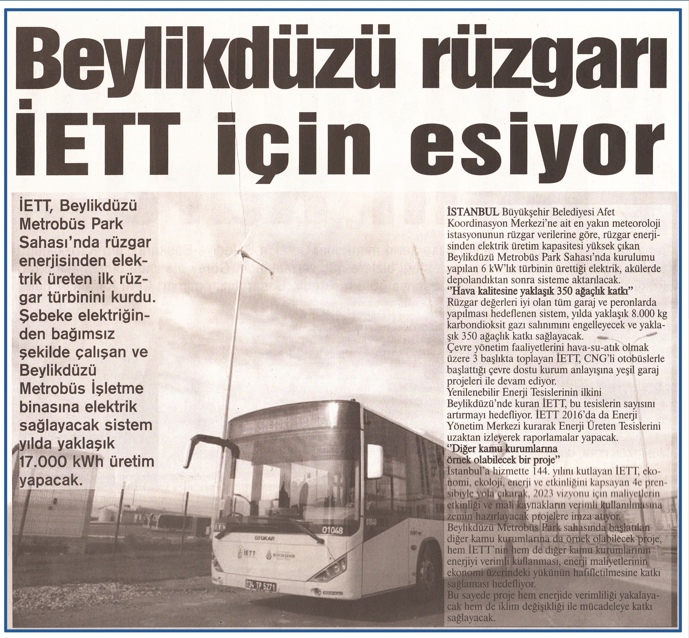 26 Kasım 2015 tarihli "MARMARA" gazetesi. İETT, Beylikdüzü Metrobüs Park Sahası'nda rüzgar enerjisinden elektrik üreten ilk rüzgar türbinini kurdu.