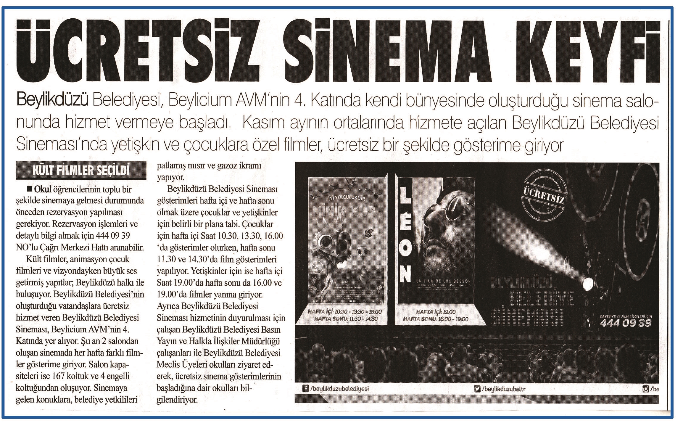 30 Kasım 2015 tarihli "YANKI" gazetesi. Beylikdüzü Belediyesi, Beylicium AVM'nin 4. Katında kendi bünyeinde oluşturduğu sinema salonunda hizmet vermeye başladı.