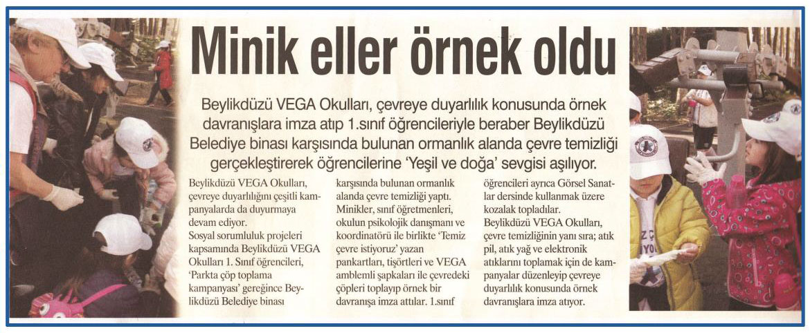 2 Mayıss 2017 tarihli "GAZETE CADDE" gazetesi. Beylikdüzü VEGA Okulları, çevreye duyarlılık konusunda örnek davranışlara imza atıp 1.sınıf öğrencileriyle beraber Beylikdüzü Belediye binası karşısında bulunan ormanlık alanda çevre temizliği gerçekleştirecek öğrencilerine 'Yeşil ve doğa' sevgisi aşılıyor.