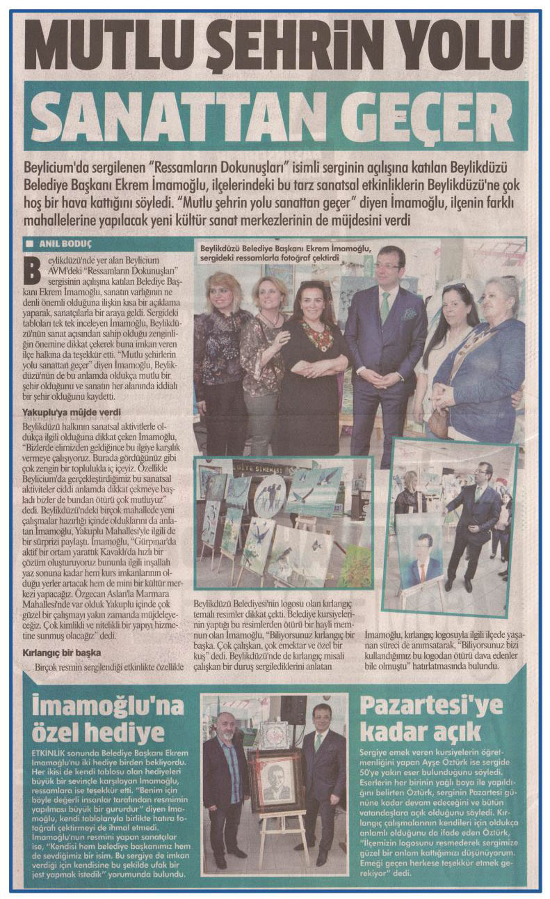 2 Mayıs 2017 tarihli "GAZETEM İSTANBUL" gazetesi. Beylicium'da sergilenen "Ressamların Dokunuşları" isimli serginin açılışına katılan Beylikdüzü Belediye Başkanı Ekrem İmamoğlu, ilçelerindeki bu tarz sanatsal etkinliklerin Beylikdüzü'ne çok hoş bir hava kattığını söyledi.