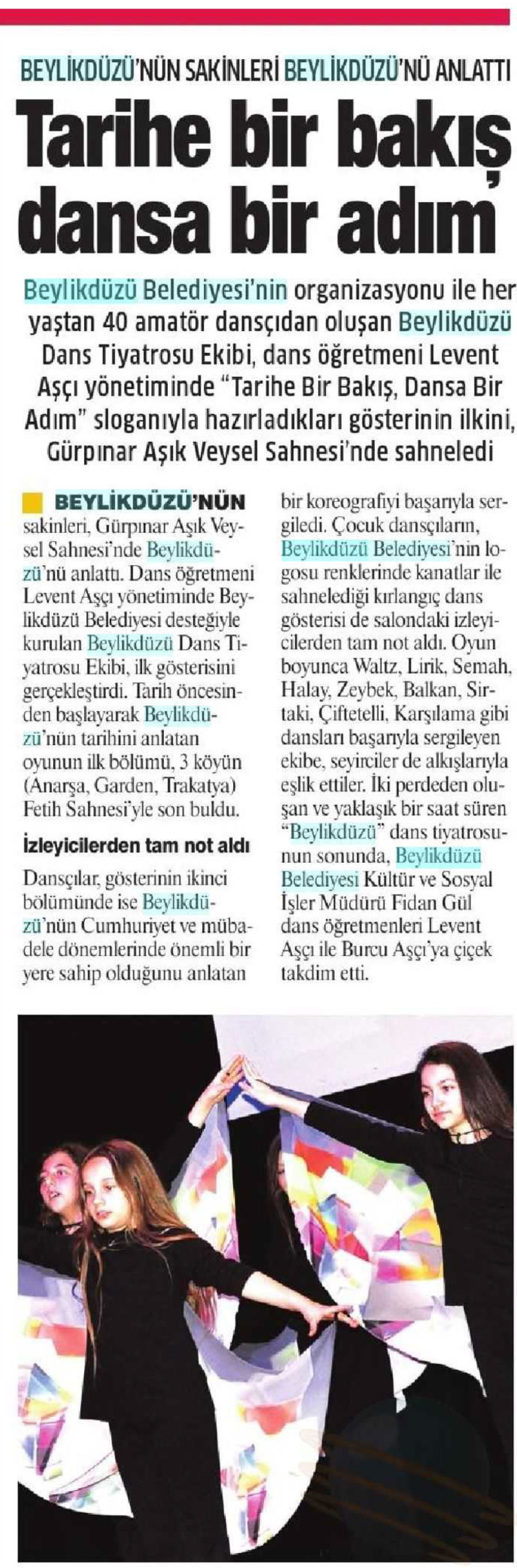 9 Mayıs 2014 tarihli "GAZETEM İSTANBUL" gazetesi. Beylikdüzü Belediyesi'nini organizasyonu ile her yaştan 40 amatör dansçıdan oluşan Beylikdüzü Dans Tiyatrosu Ekibi, dans öğretmeni Levent Aşçı yönetiminde "Tarihe Bir Bakış, Dansa Bir Adam" sloganıyla hazırladıkları gösterinin ilkini, Gürpınar Aşık Veysel Sahnesi'nde sahneledi.