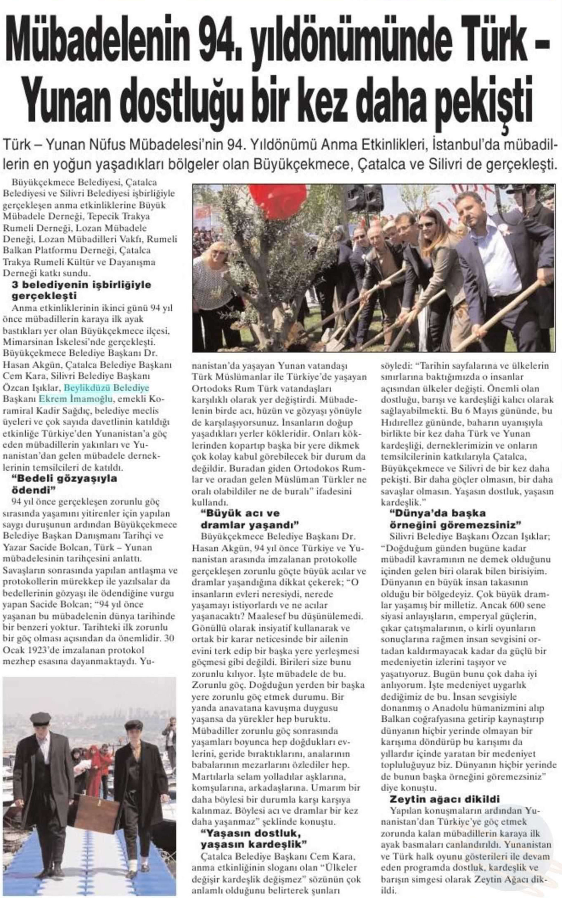 9 Mayıs 2017 tarihli "YURTHABER" gazetesi. Türk- Yunan Nüfus Mübadelesi'nin 94. Yıldönümü Anma Etkinlikleri, İstanbul'da mübadillerin en yoğun yaşadıkları bölgeler olan Büyükçekmece, Çatalca ve Silivri'de gerçekleşti.