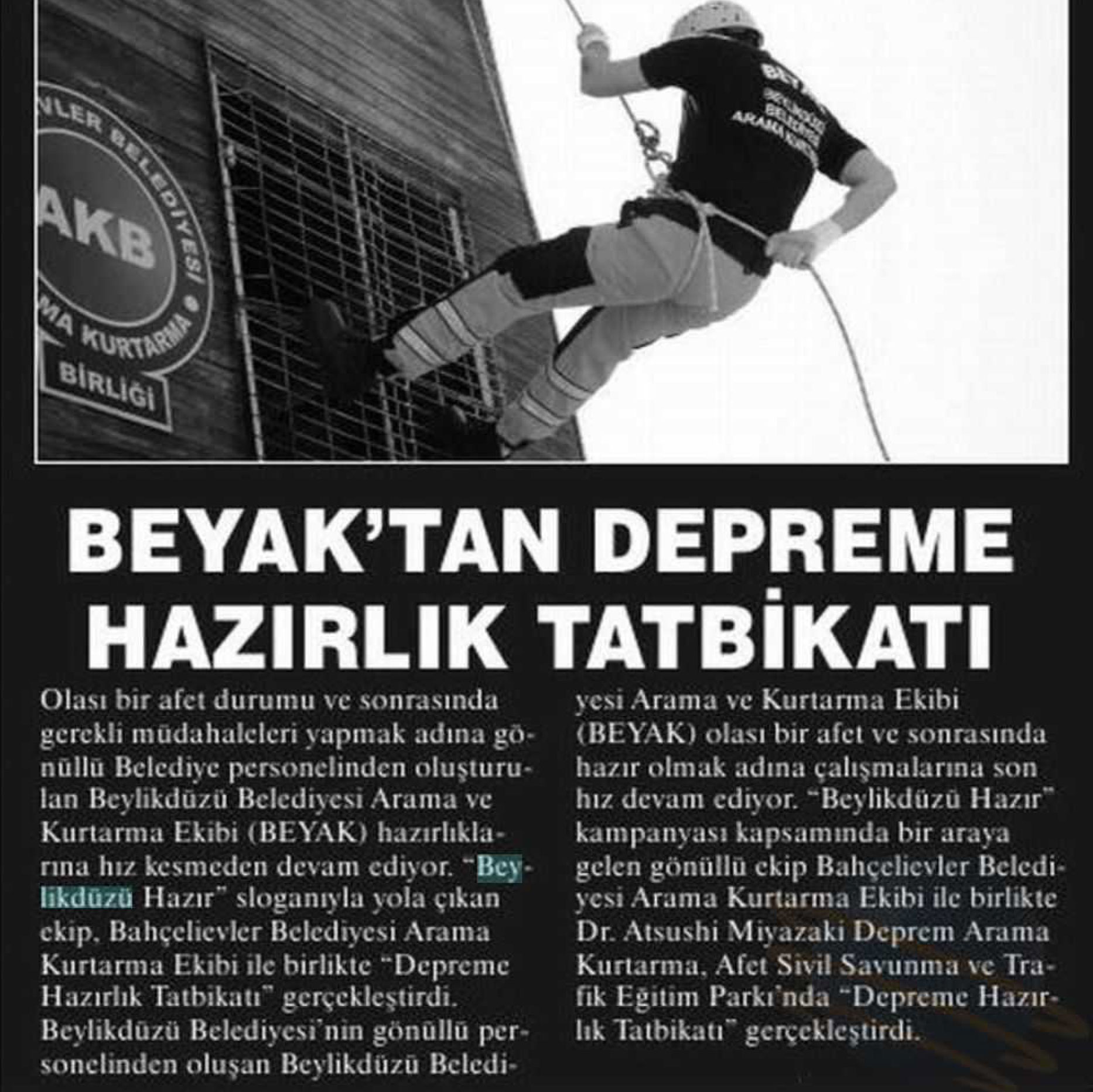 11 Mayıs 2017 tarihli "BÜYÜKÇEKMECE" gazetesi. Olası bir afet durumu ve sonrasında gerekli müdahaleleri yapmak adına gönüllü belediye personelinden oluşturulan Beylikdüzü Belediyesi Arama ve Kurtarma Ekibi (BEYAK) hazırlıklarına hız kesmeden devam ediyor.