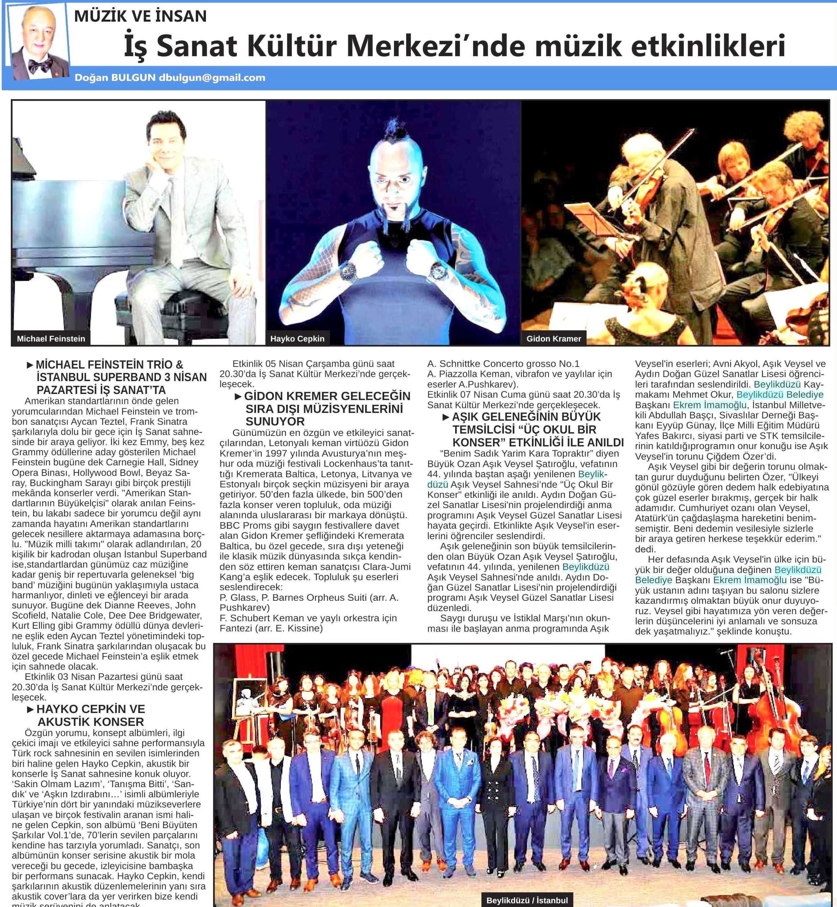 1 Nisan 2017 tarihli ''ANKARA24SAAT' gazetesi. İş Sanat Kültür Merkezi'nde Müzik etkinlikleri kapsamında bir çok isim bir araya geldi. İş Sanat Sahnesi, Michael, Feinstein, Hayko Cepkin, Gidon Kramer'e kadar bir çok ismi ağırladı. Batı İstanbul'un Başkenti Beylikdüzü'nde ise kent sakinleri kültür ve sanat dolu bir etkinlikle bir araya geldiler. Beylikdüzü Aşık Veysel Sahnesi'nde bir araya gelen öğrenciler ise usta ozan Aşık Veysel'i Anma programı düzenlediler.