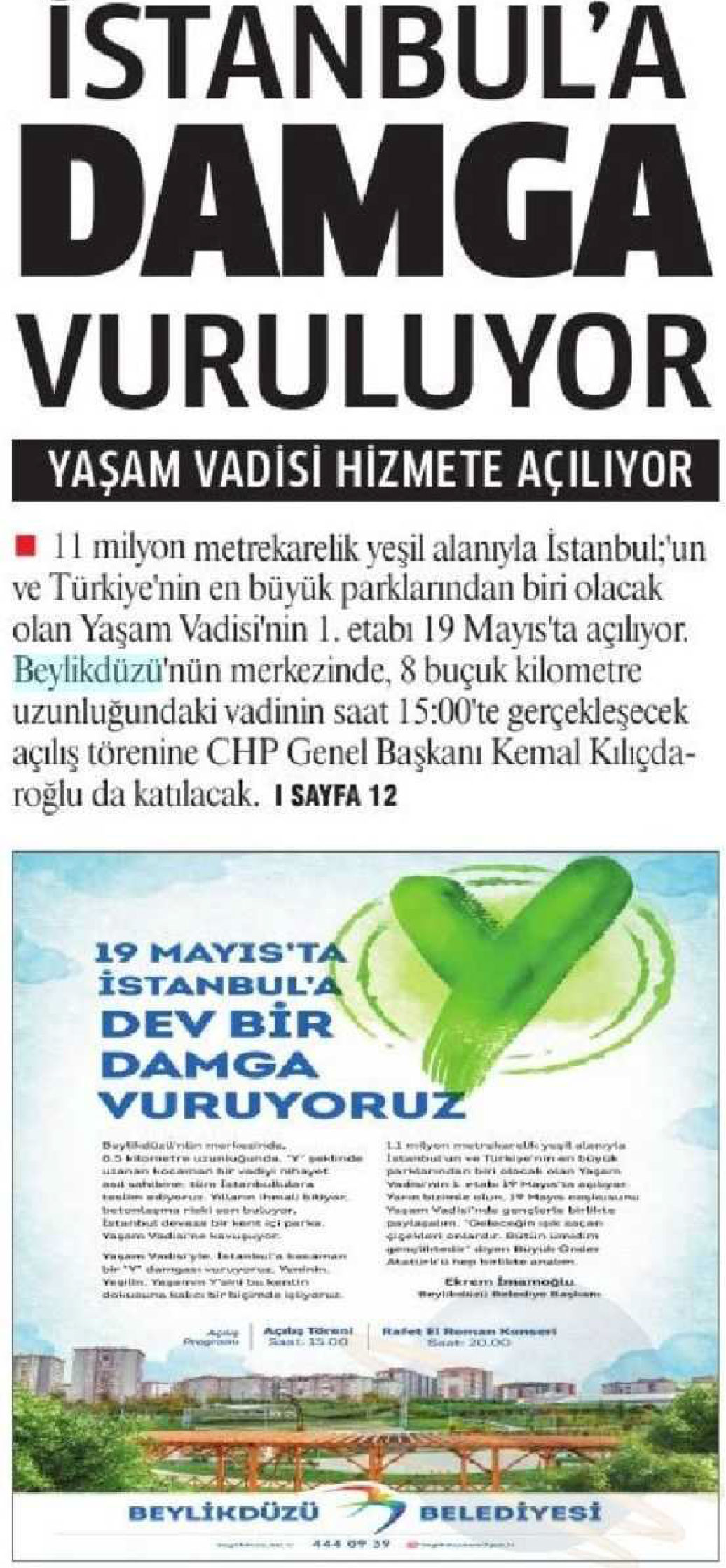18 Mayıs 2017 "Gazetemİstanbul." 11 Milyon metrekarelik yeşil alanıyla İstanbul'un ve Türkiye'nin en büyük parklarından biri olacak olan Yaşam Vadisi'nin 1. etabı 19 Mayıs'ta açılıyor. Beylikdüzü'nün merkezinde 8 buçuk kilometre uzunluğundaki vadinin saat 15:00' de gerçekleşecek açılış törenine CHP Genel Başkanı Kemal Kılıçdaroğlu da katılacak.