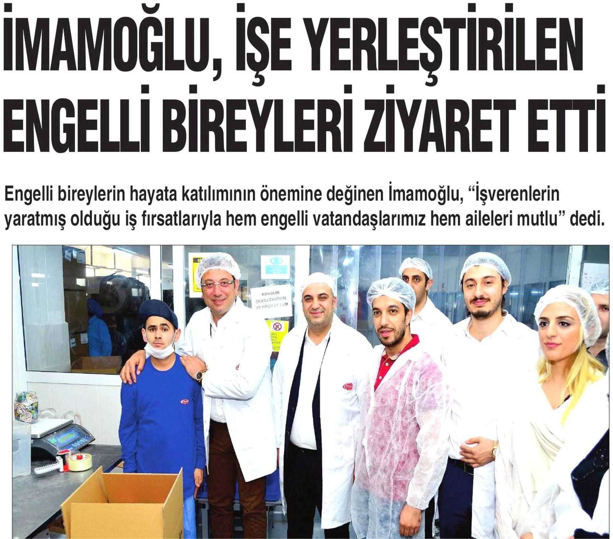 18 Mayıs 2017 tarihli "NABIZ" gazetesi. Engelli bireylerin hayata katılımının önemine değinen İmamoğlu, "İşverenlerin yaratmış olduğu iş fırsatlarıyla hem engelli vatandaşlarımız hem aileleri mutlu" dedi.