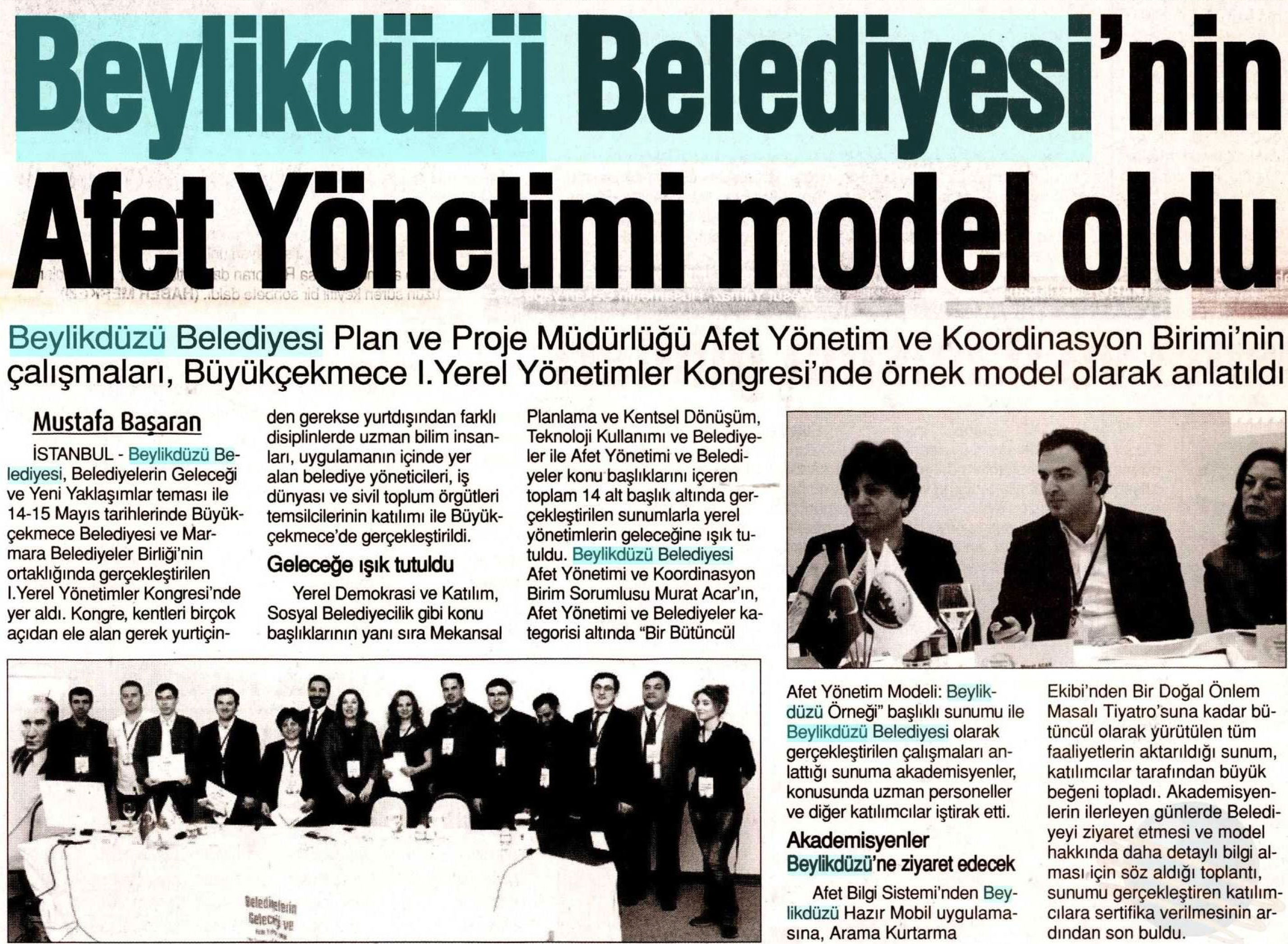 17 Mayıs 2017 "YENİ ÇAĞRI" gazetesi. Beylikdüzü Belediyesi Plan ve Proje Müdürlüğü Afet Yönetim Ve Koordinasyon Birimi'nin Çalışmaları, Büyükçekmece 1. Yerel Yönetimler Kongresi'nde örnek model olarak anlatıldı. Yerel Demokrasi Ve Katılım, Sosyal Belediyecilik gibi konu başlıklarının yanı sıra Mekansal Planlama Ve Kentsel Dönüşüm, Teknoloji Kullanımı Belediyeler ile Afet Yönetimi ve Belediyeler konu başlıklarını içeren toplam 14 alt başlık altında gerçekleştirilen sunumlarla yerel yönetimlerin geleceğine ışık tutuldu.