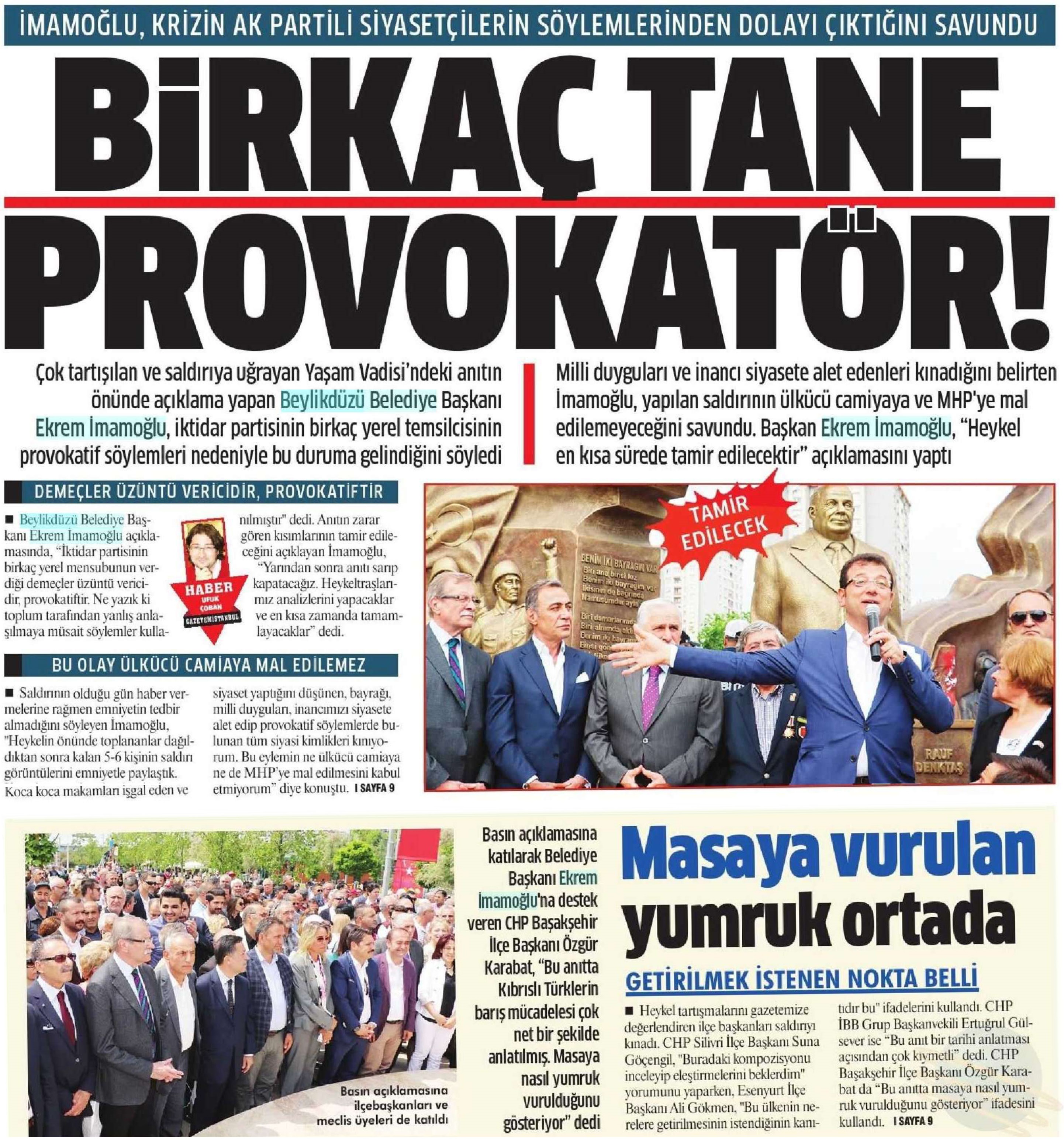 25 Mayıs 2017 tarihli "GAZETEM İSTANBUL" gazetesi. Çok tartışılan ve saldırıya uğrayan Yaşam Vadisi'ndeki Rauf Dentaş anıtının önünde açıklama yapan Beylikdüzü Belediye Başkanı Ekrem İmamoğlu, İktidar partisinin birkaç yerel temsilcisinin provokatif söylemleri nedeniyle bu duruma gelindiğini söyledi. Milli duyguları ve inancı siyasete alet edenleri kınadığını belirten İmamoğlu, yapılan saldırının ülkücü camiaya ve MHP' ye mal edilemeyeceğini savundu. Başkan Ekrem İmamoğlu, "Heykel en kısa sürede tamir edilecektir" açıklamasını yaptı. Basın açıklamasına katılarak Belediye Başkanı Ekrem İmamoğlu'na destek veren CHP Başakşehir İlçe Başkanı Özgür Karabat, "Bu anıtta Kıbrıslı Türklerin barış mücadelesi çok net bir şekilde anlatılmış. Masaya nasıl yumruk vurulduğunu gösteriyor" dedi. Basın açıklamasına Beylikdüzü CHP İlçe Başkanı Taşkın Özer ve meclis üyeleri de katıldı.