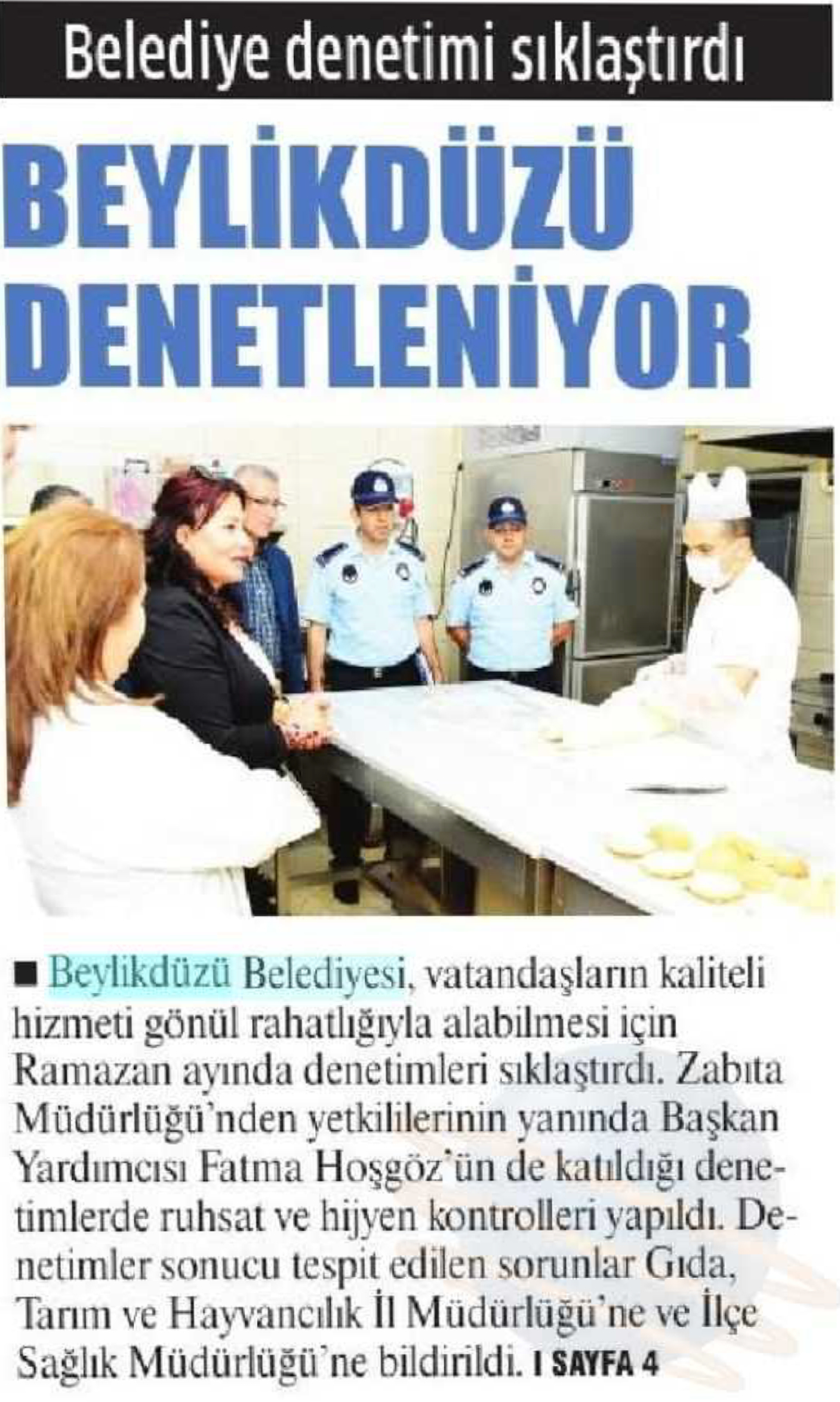 2 Haziran 2017 tarihli "GAZETEM İSTANBUL" gazetesi. Beylikdüzü Belediyesi, vatandaşların kaliteli hizmeti gönül rahatlığıyla alabilmesi için Ramazan ayında denetimleri sıklaştırdı. Zabıta Müdürlüğü'nden yetkililerin yanında Başkan Yardımcısı Fatma Hoşgöz'ün de katıldığı denetimlerde ruhsat ve hijyen kontrolleri yapıldı