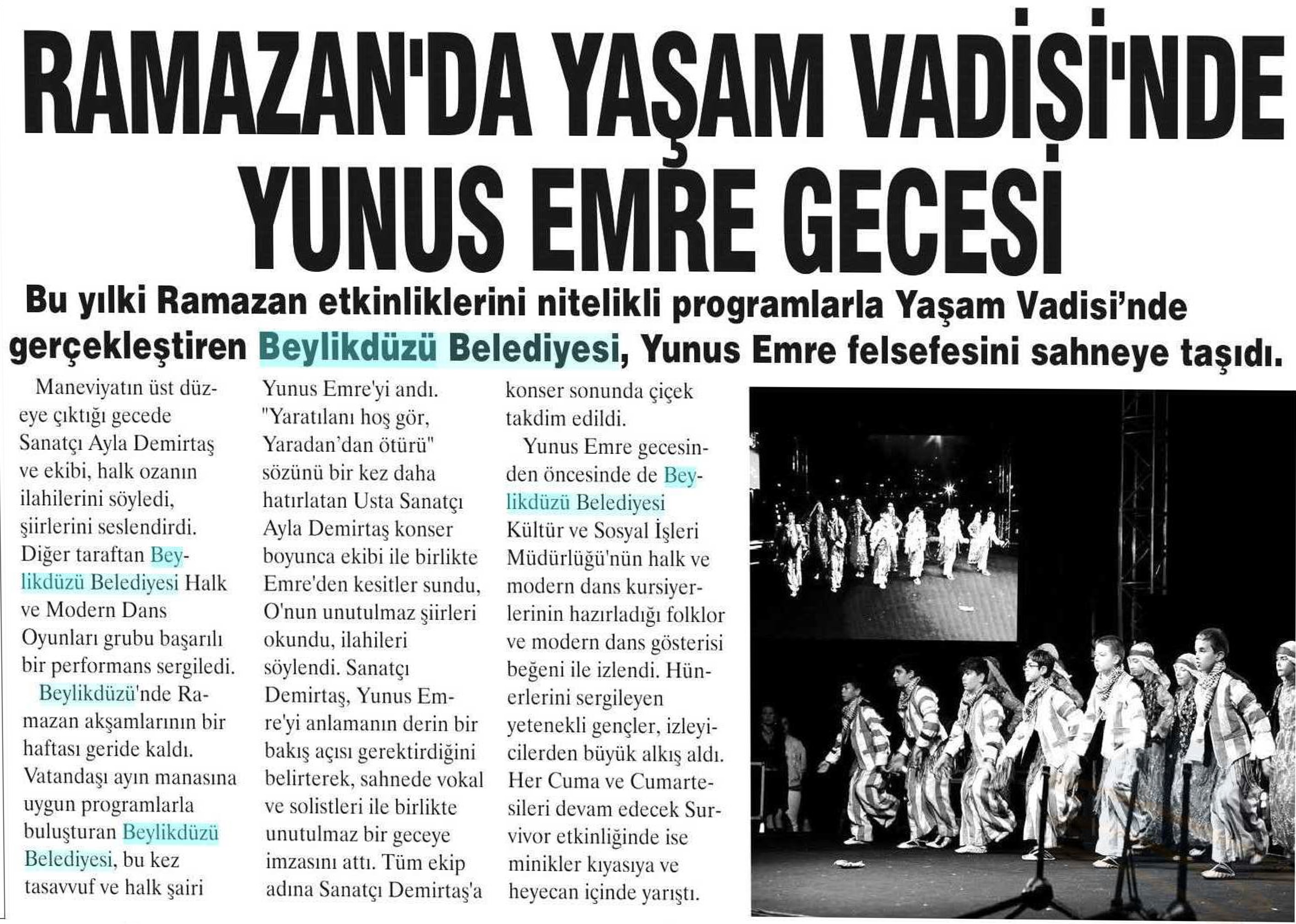 6 Haziran 2017 tarihli "YURT HABER" gazetesi. Bu yılki Ramazan etkinliklerini nitelikli programlarla Yaşam Vadisi'nde gerçekleştiren Beylikdüzü Belediyesi, Yunus Emre felsefesini sahneye taşıdı.