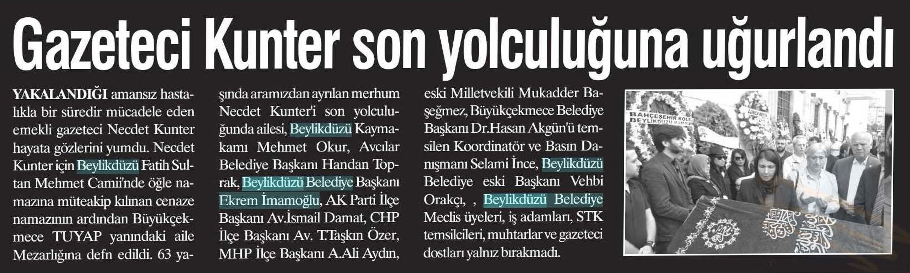 8 Haziran 2017 tarihli "BÖLGE'DE DEĞİŞİM" gazetesi. Yakalandığı amansız hastalıkla bir süredir mücadele eden emekli gazeteci Necdet Kunter hayata gözlerini yumdu. Necdet Kunter için Beylikdüzü Fatih Sultan Mehmet Camii'nde öğle namazına müteakip kılınan cenaze namazının ardından Büyükçekmece TUYAP yanındaki aile mezarlığına defnedildi.