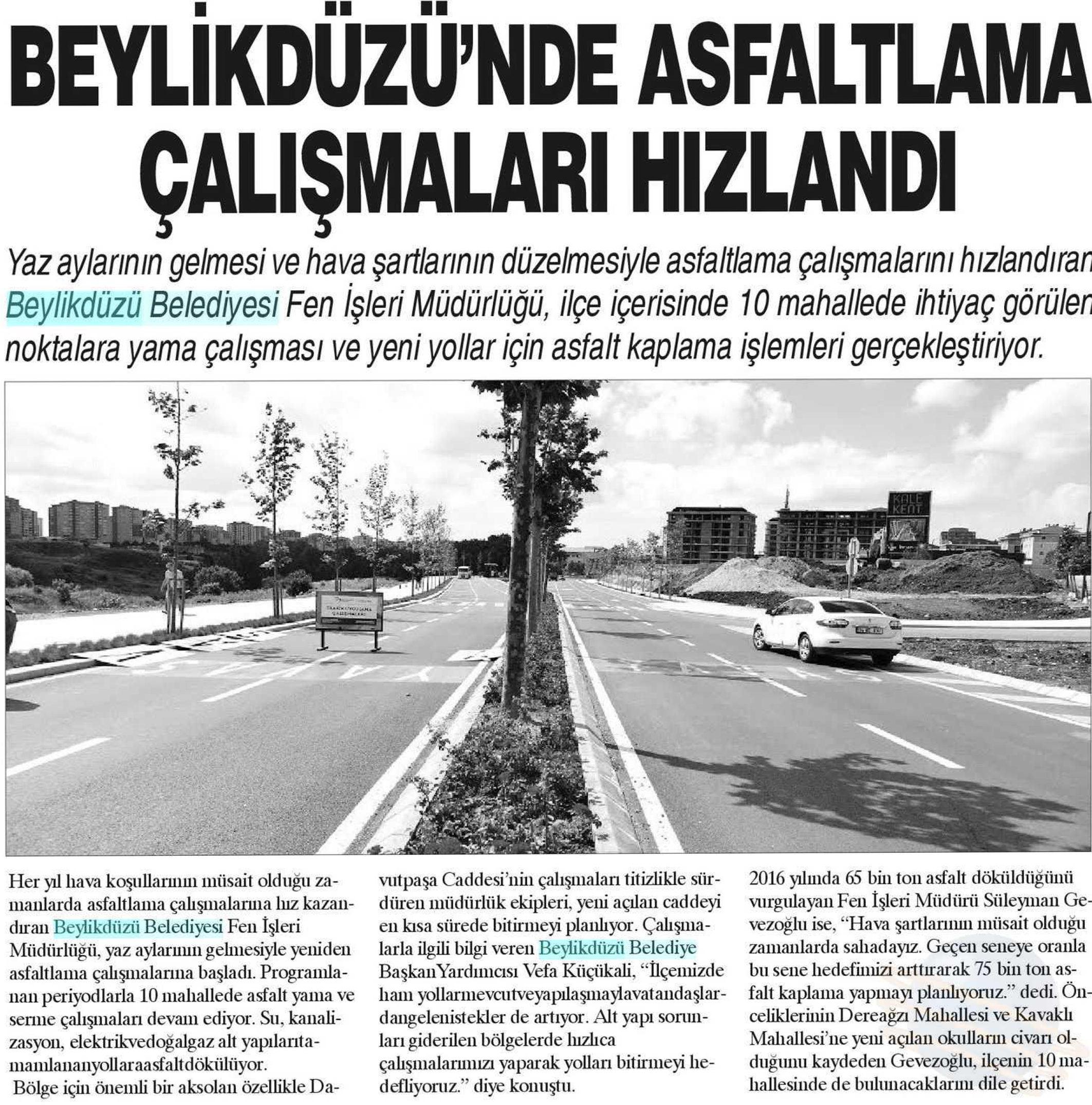 15 Haziran 2017 tarihli "BÜYÜKÇEKMECE" gazetesi. Yaz aylarının gelmesi ve hava şartlarının düzelmesiyle asfaltlama çalışmalarını hızlandıran Beylikdüzü Belediyesi Fen İşleri Müdürlüğü, ilçe içerisinde 10 mahallede ihtiyaç görülen noktalara yama çalışması ve yeni yollar için asfalt kaplama işlemleri gerçekleştiriyor.