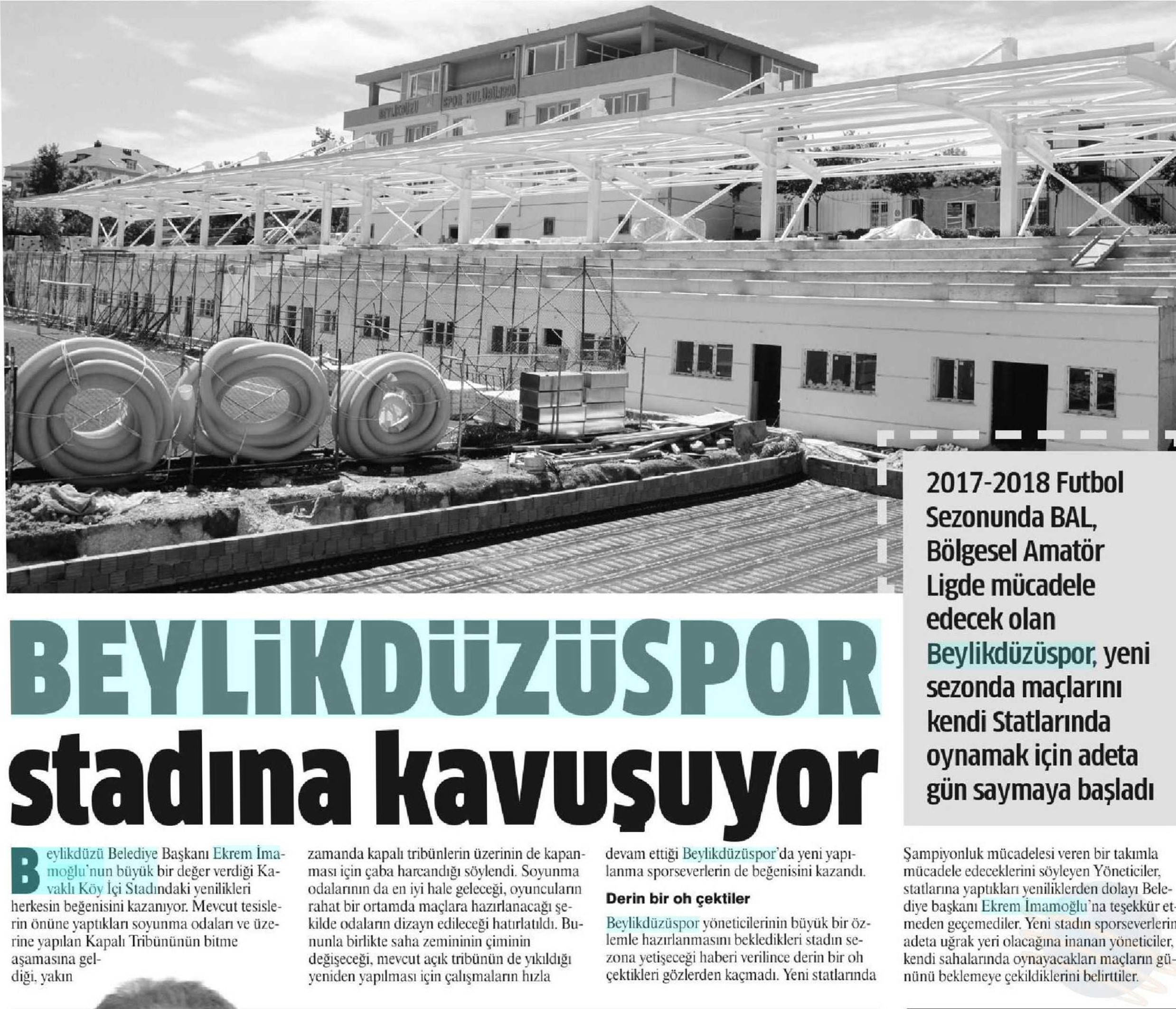 15 Haziran 2017 tarihli "GAZETEM İSTANBUL" gazetesi. Beylikdüzü Belediye Başkanı Ekrem İmamoğlu'nun büyük bir değer verdiği Kavaklı Köy içi Stadındaki yenilikleri herkesin beğenisini kazanıyor. 2017-2018 Futbol sezonunda BAL Bölgesel Amatör Ligde mücadele edecek olan Beylikdüzüspor, yeni sezonda maçlarını kendi statlarında oynamak için adeta gün saymaya başladı.